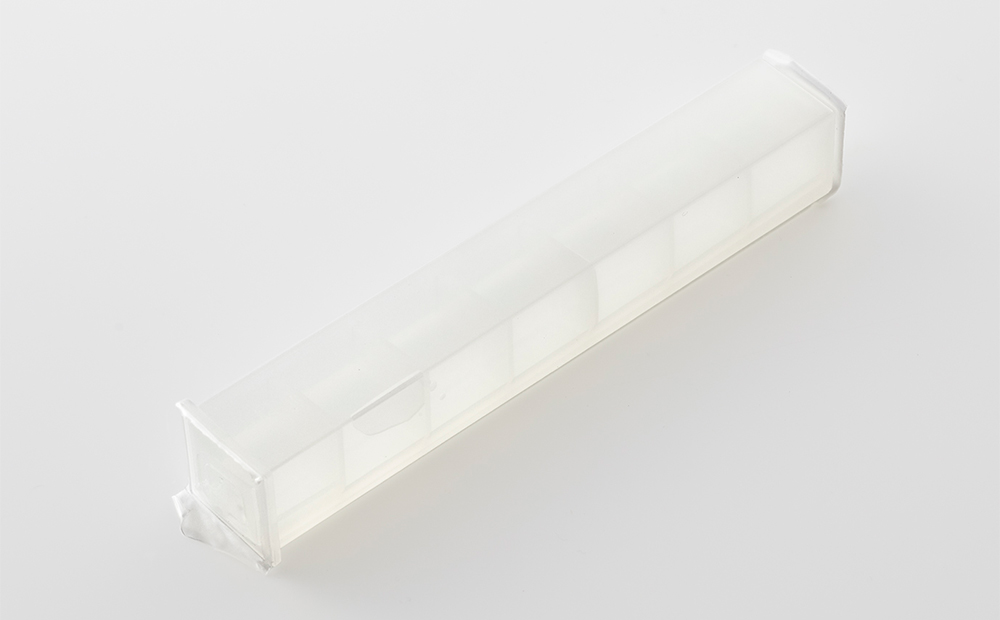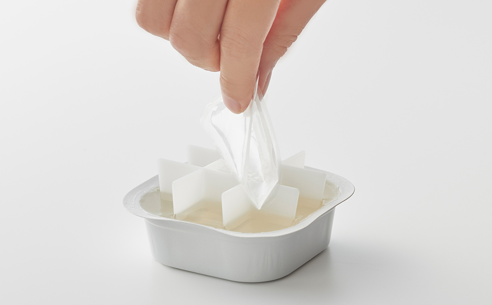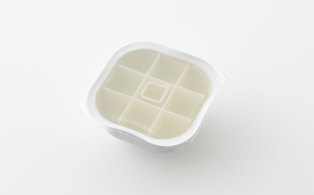 従来はプラスチック容器から寒天を引き出すものでしたが、2022年より井形の枠を⼊れることで寒天が切れる仕組みに変更。アルミ缶の使⽤により68%のプラスチック削減を実現しました。