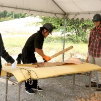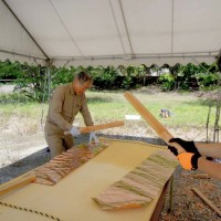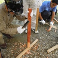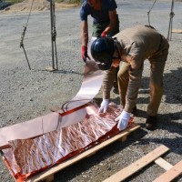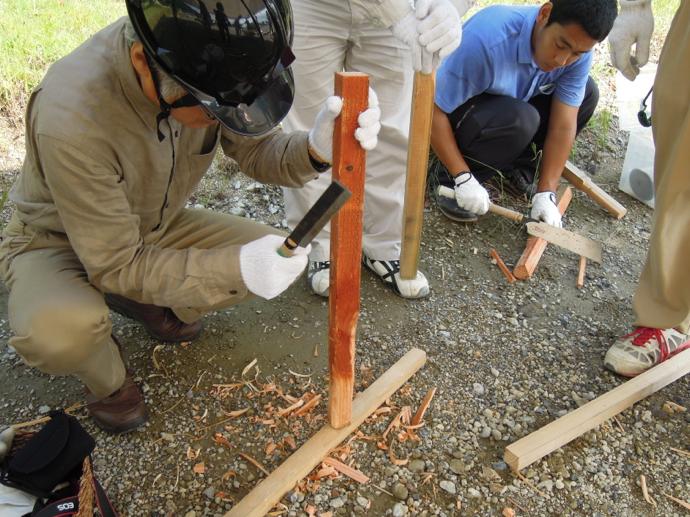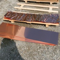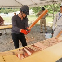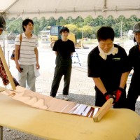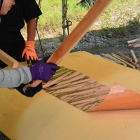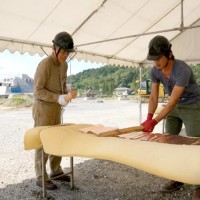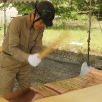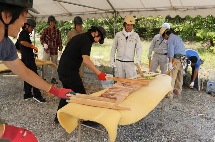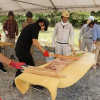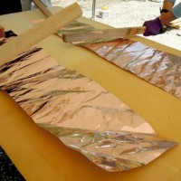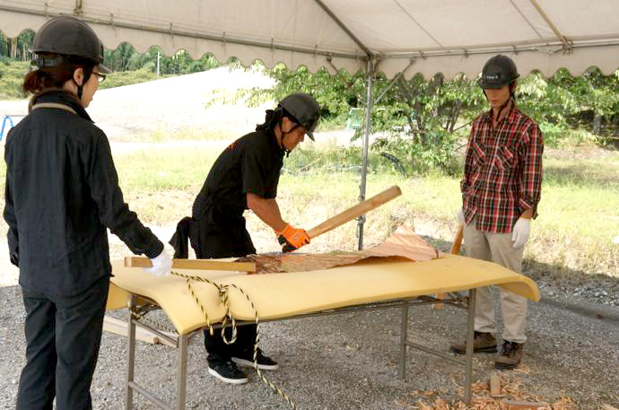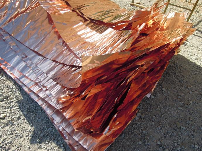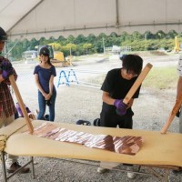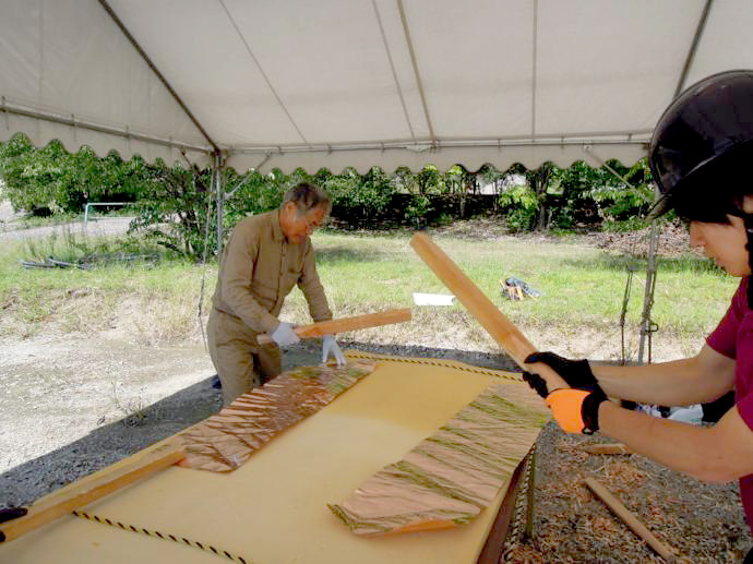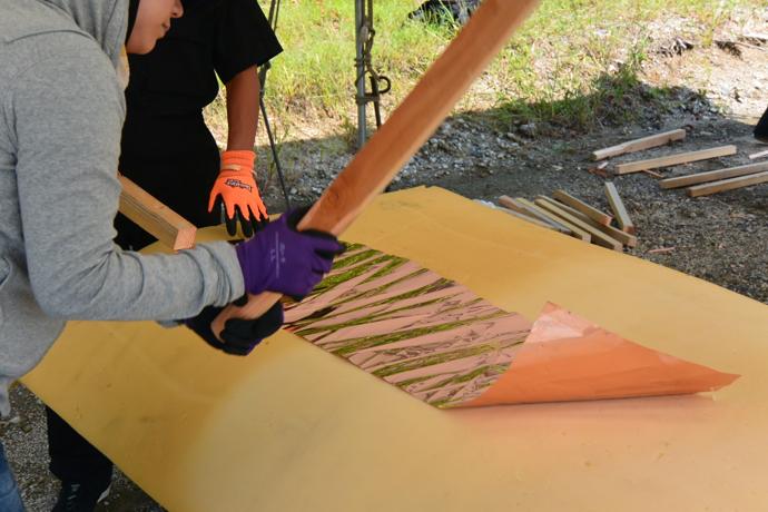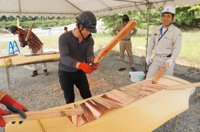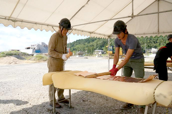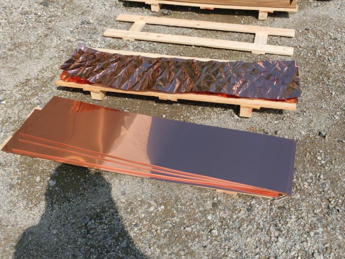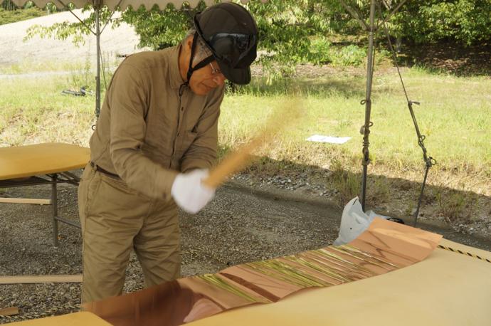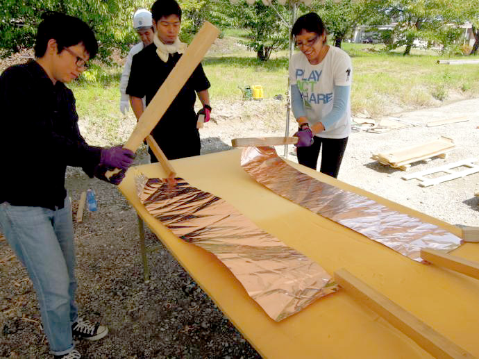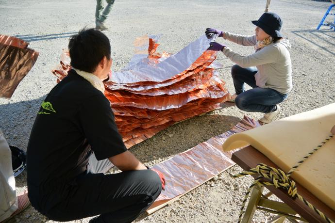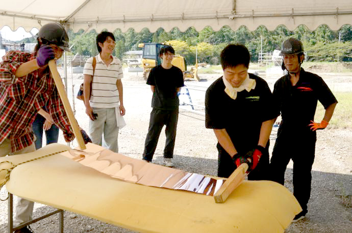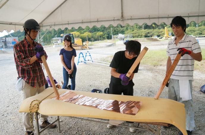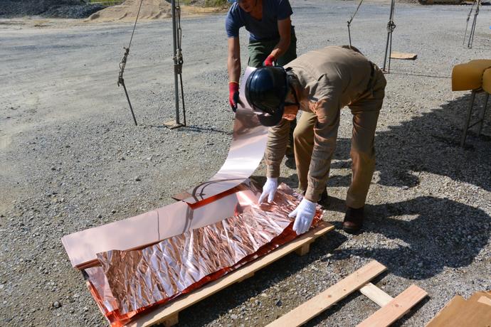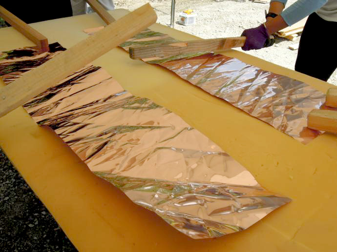 屋根の一部や窓枠に使用される銅板。藤森照信先生ご指導のもと、従業員・関係業者さま・大学生(滋賀県立大学・京都大学)が集まり製作しました。バンッ!バンッ!バンッ!と叩くこと410枚。ランダムな凹凸が個性的です。