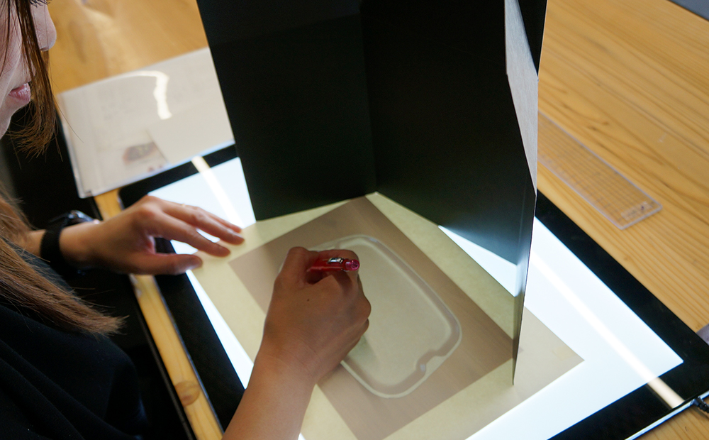 なるべく本物に近づけるため、ライトテーブルを使い丁寧に輪郭を描きます。