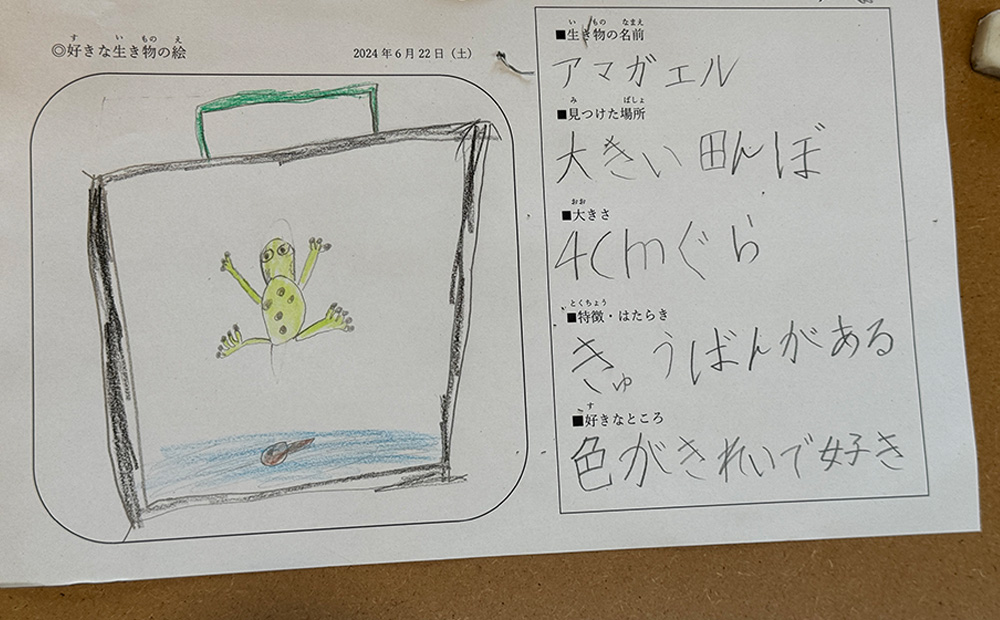 子供達には今日のお気に入りの生き物を紙に記録してもらいました。