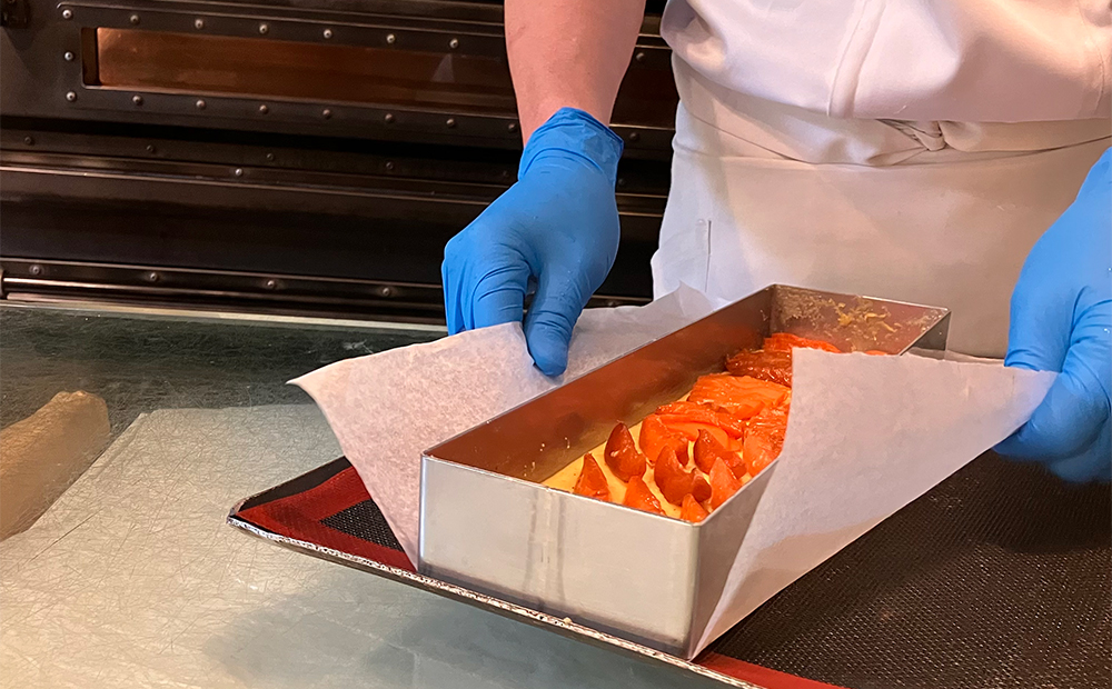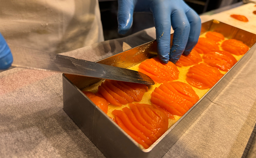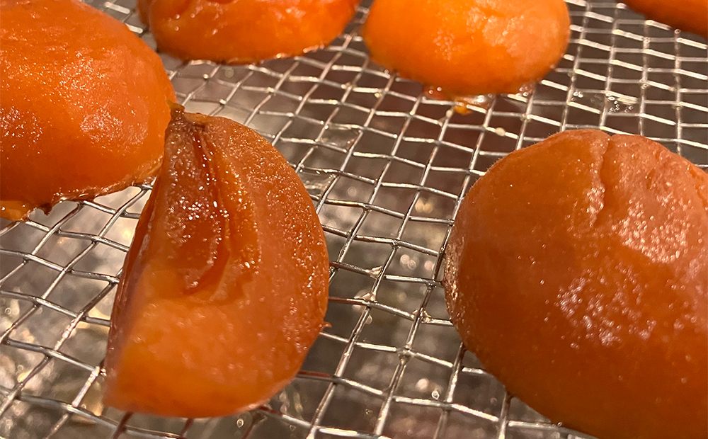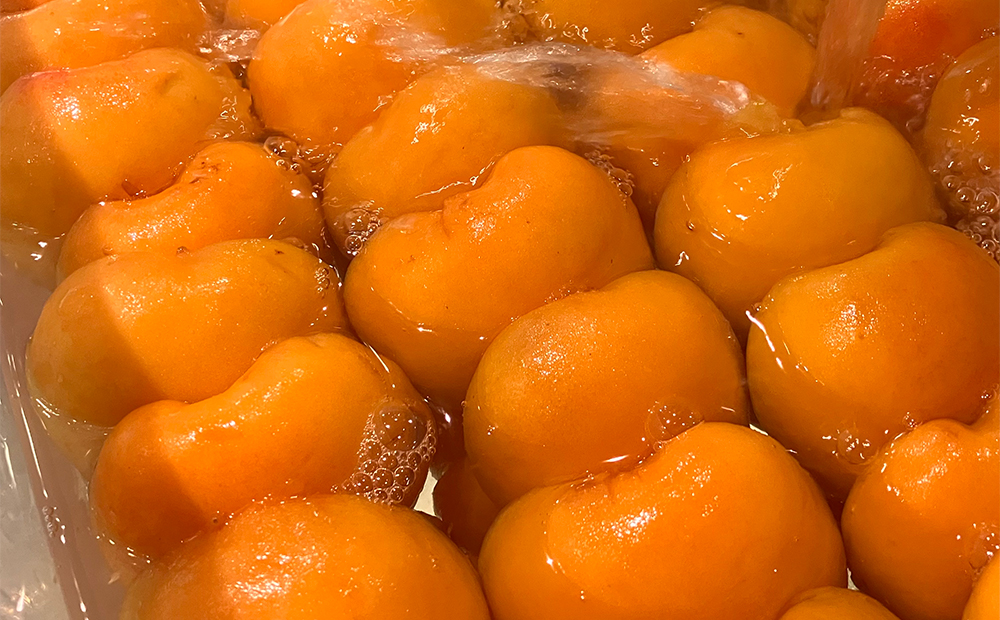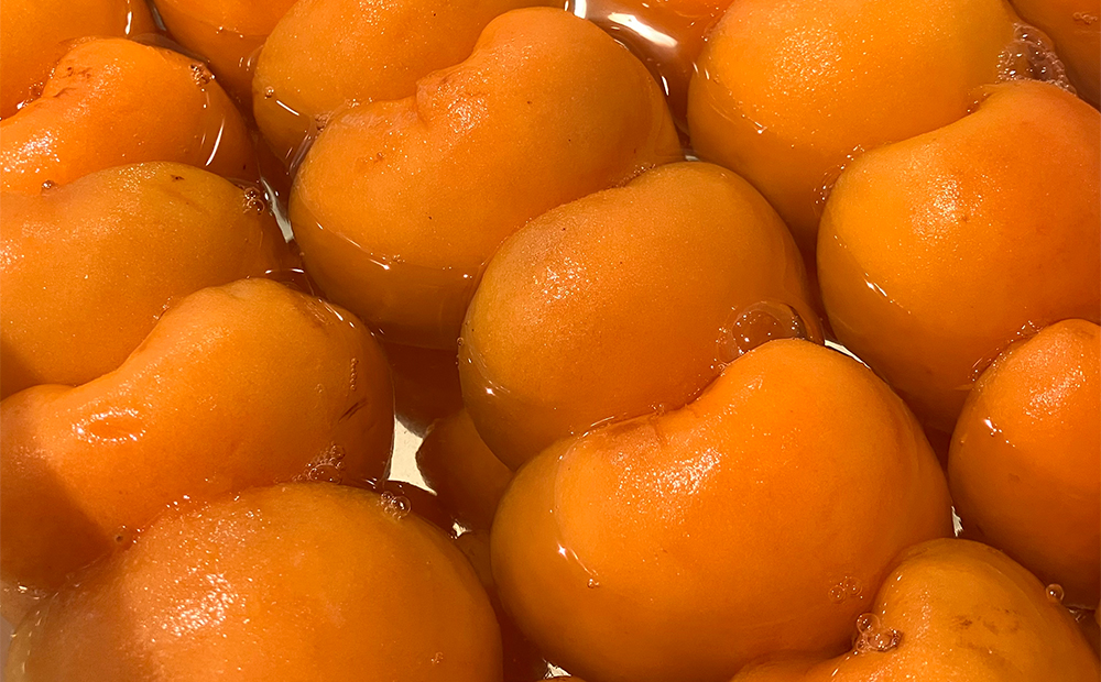 半分にカットしたあんずを綺麗に並べ、そこへ熱々のシロップをゆっくりと注ぎ、じっくりとコンポートにしていきます。