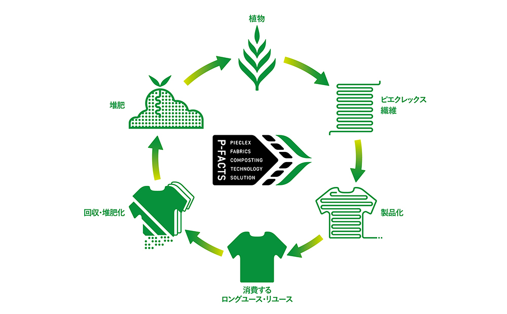 「P-FACTS」は、ピエクレックス社が「ピエクレックス」を使用した製品を「回収」「分別」「堆肥化」し、最終的に「農業や林業での堆肥利用」まで実施する仕組みです。
