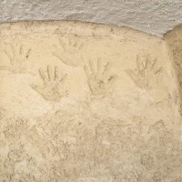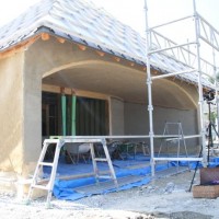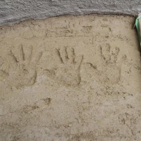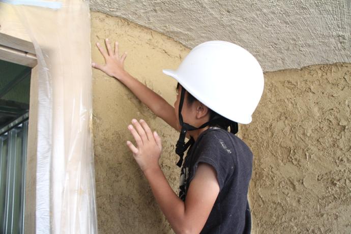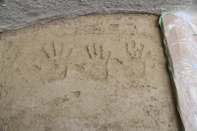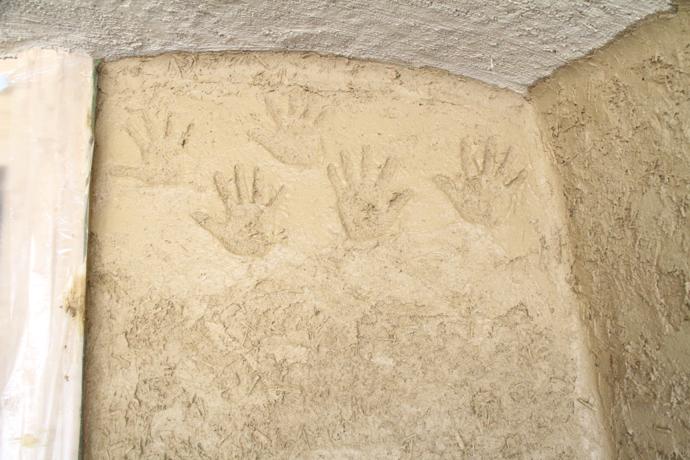 社長は厚めにしっかりと。グランシェフは職人のような丁寧さで。会長・女将もコテを手に、土壁塗りの完成です。場所は、メインショップ北ポーチ。記念の手形も見つけてください。