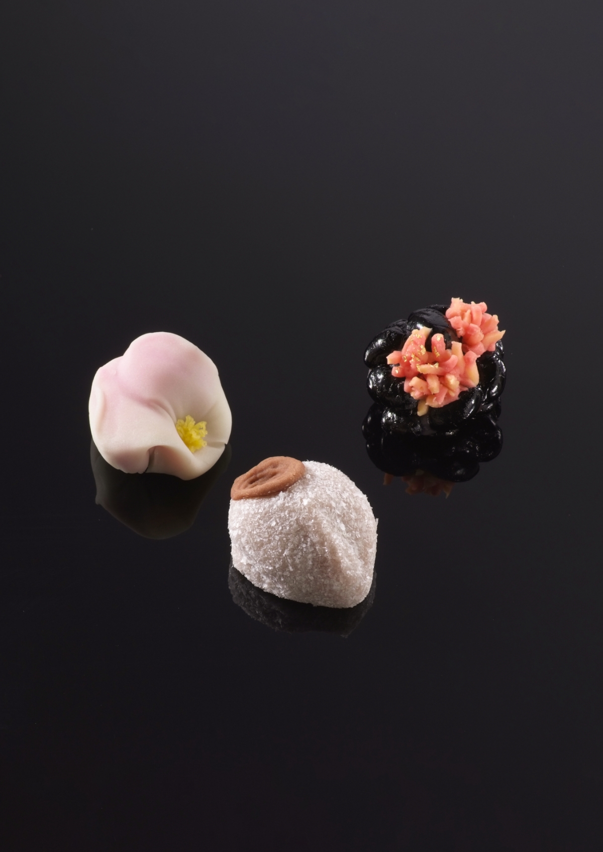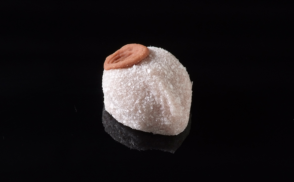 軒端(のきば)に吊るした渋柿は、こがらしが吹くたびに甘みを増して。大納言入りの干柿餡を雪平(せっぺい)で包み、氷餅をまぶしました。