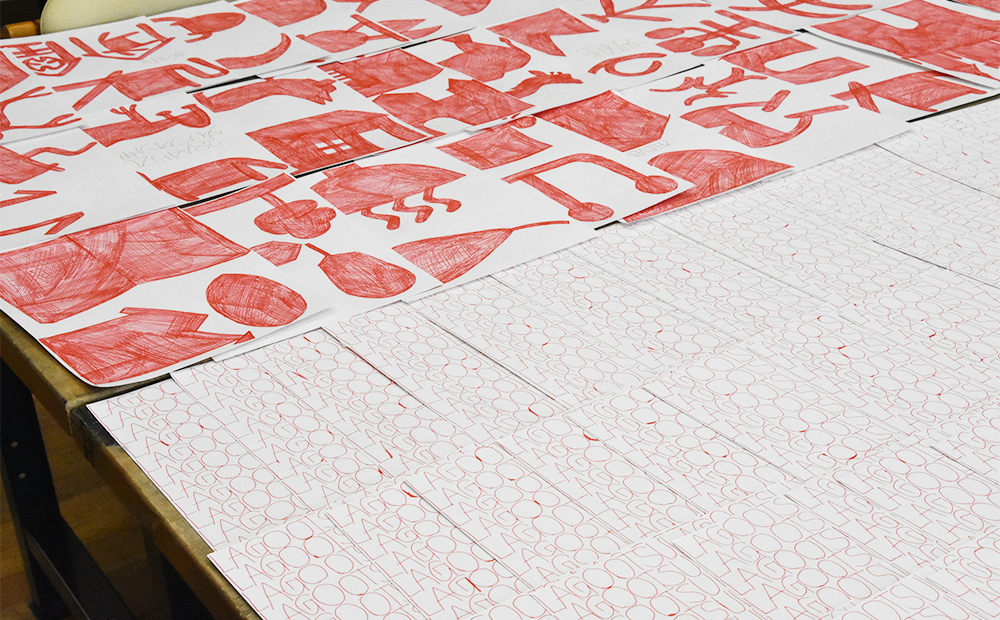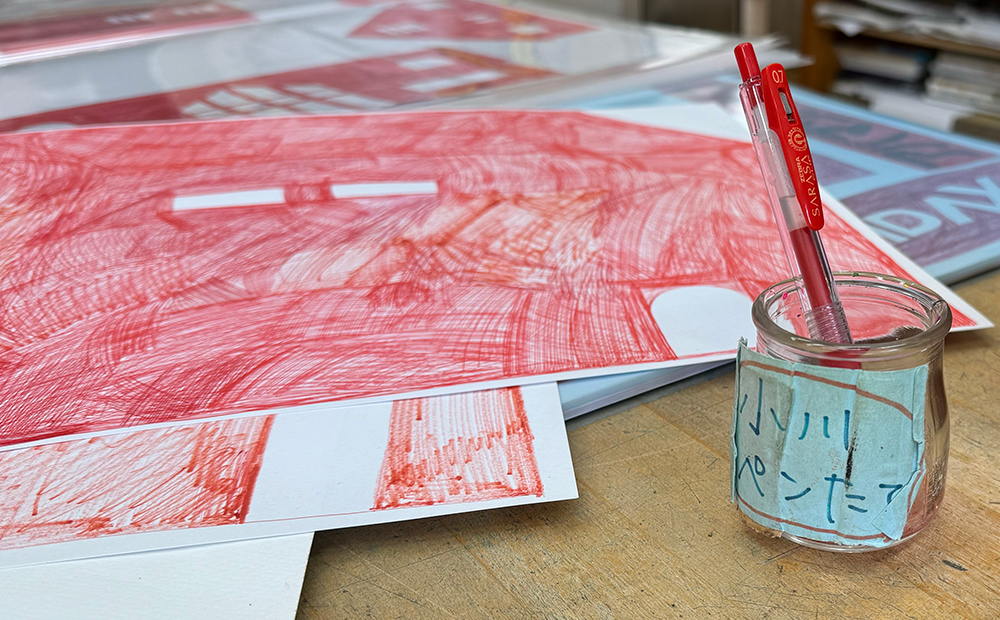 小川さんは生活の中で目にしてきた看板や建物、文字などを赤色のボールペンを使用して描かれます。過去にはスタッフさんも色や太さの違うペンをいろいろと渡してみたそうですが、気が付くと0.7mmの赤いボールペンに持ち替えておられるとのこと。