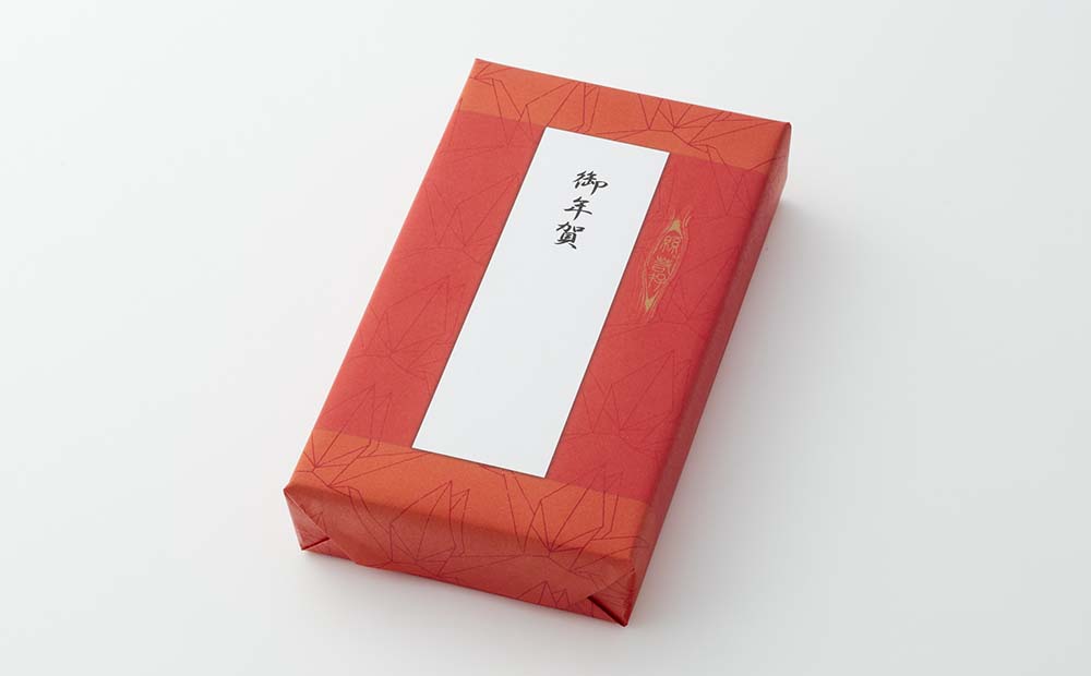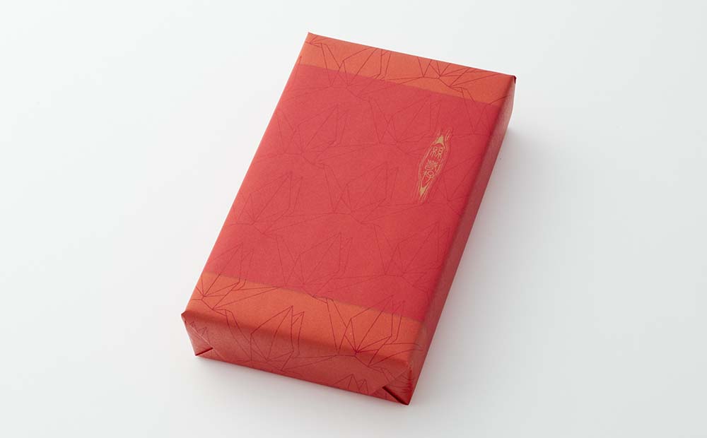 折り鶴をつなぎ合わせた模様と掛紙を一体化させ、祝いや感謝の気持ちを大切にくるみながら環境に配慮したデザインに仕上げました。