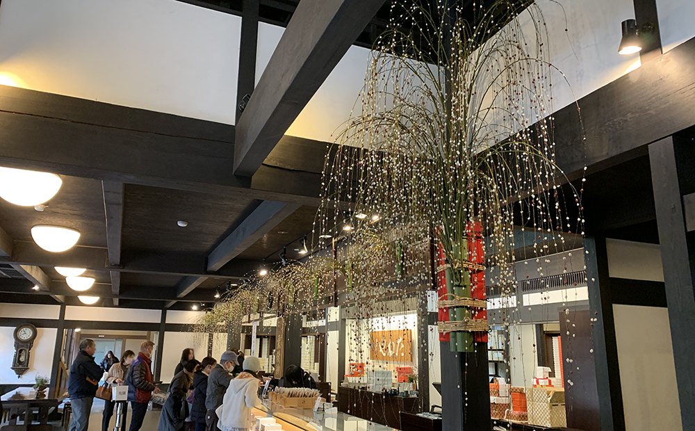 完成した餅花は、年末からお正月飾りとしてたねやの店舗で飾ります。滋賀県内の「日牟禮乃舍」や「彦根美濠の舎」ではさらに華やかに飾ります。