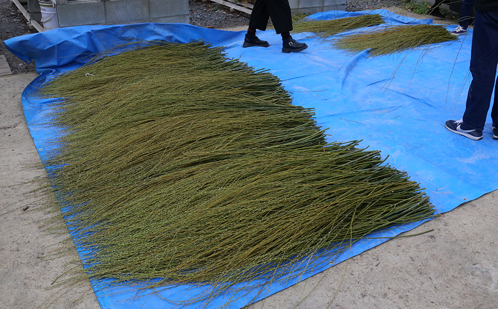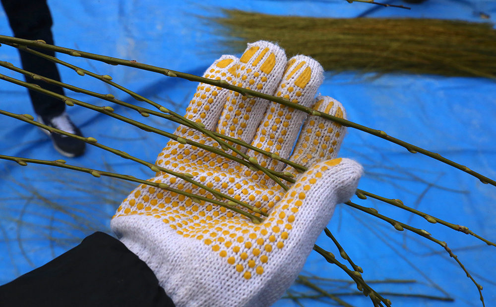 店舗でぽろりととれないように柳の芽をひとつひとつ取り除き、納品する店舗にあわせサイズをわけ、20〜30本ずつ束にしていきます。