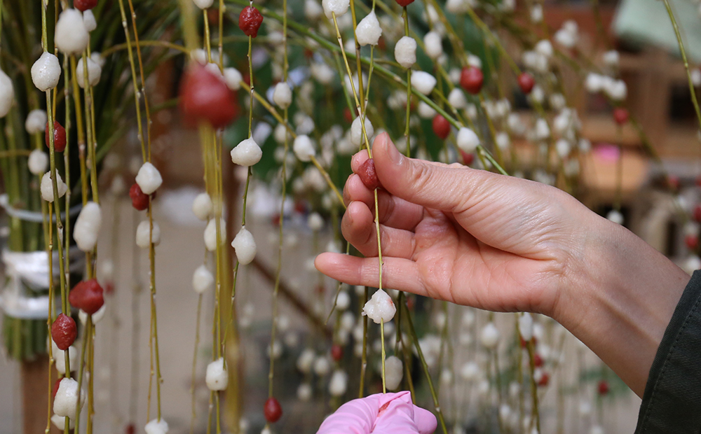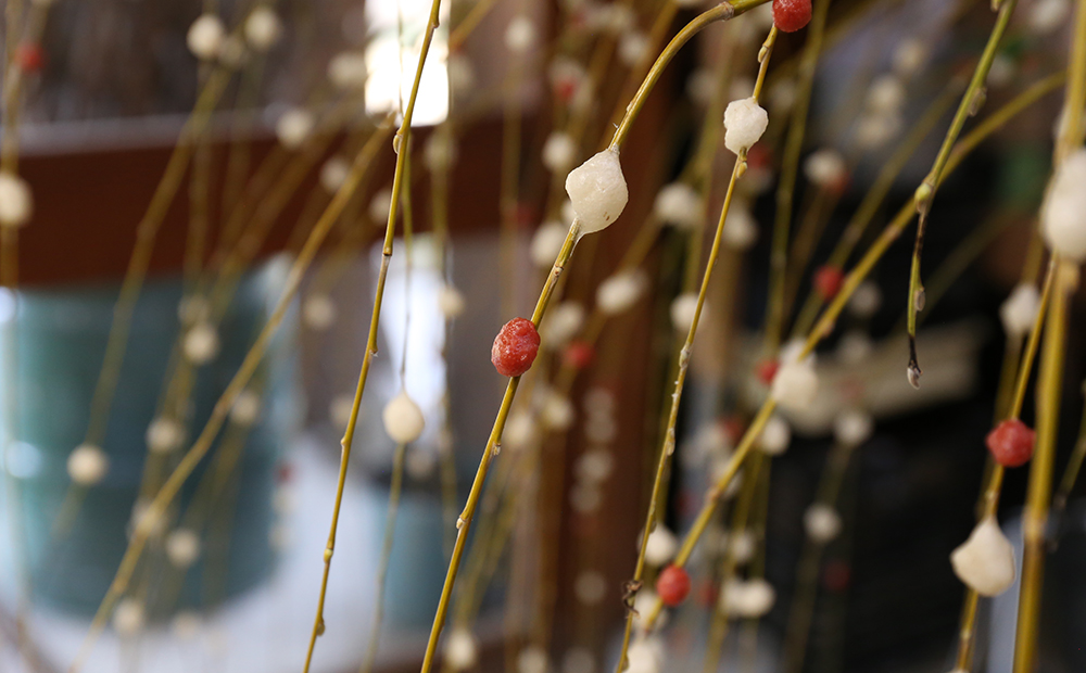 店舗にお越しの際はひとつひとつスタッフの手作業でつけられた、鮮やかな餅花をぜひお近くでご覧ください。