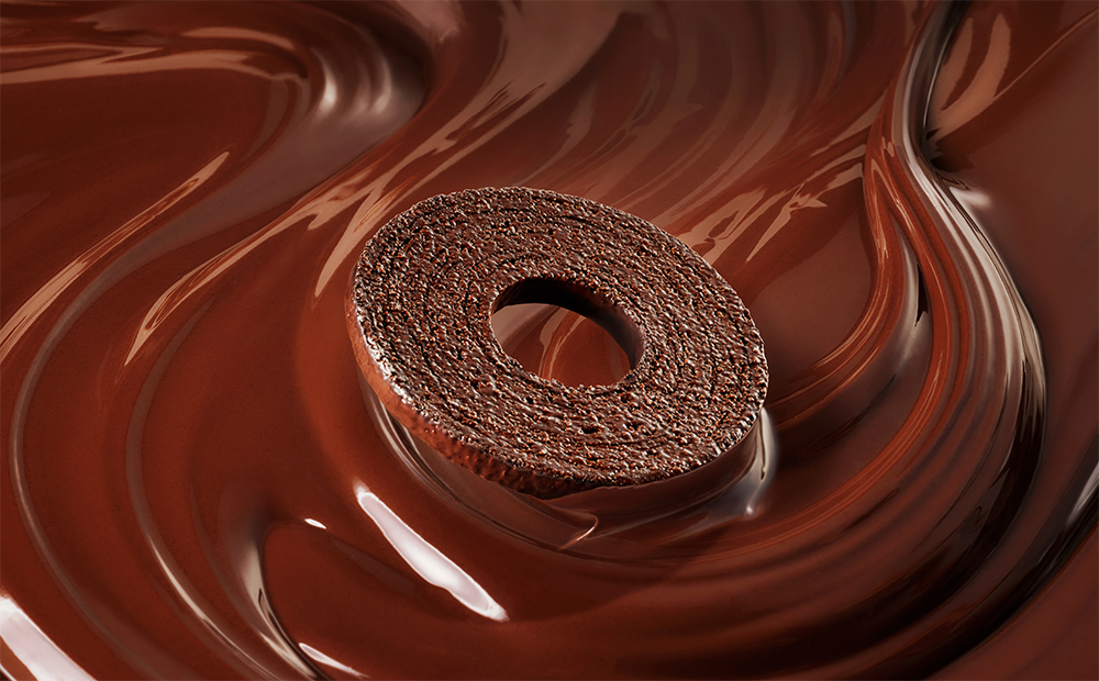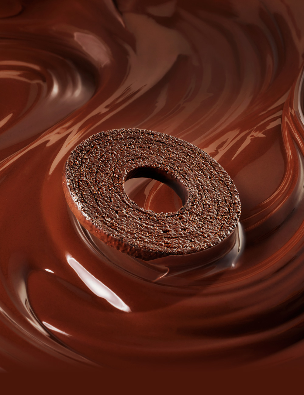 専用のレシピで焼き上げたバームクーヘンを熱風で乾燥させ軽い口あたりにし、数種類をブレンドしたショコラをほどよく染み込ませたお菓子です。サクッと軽い食感とカカオの豊かな風味をお楽しみいただけます。
