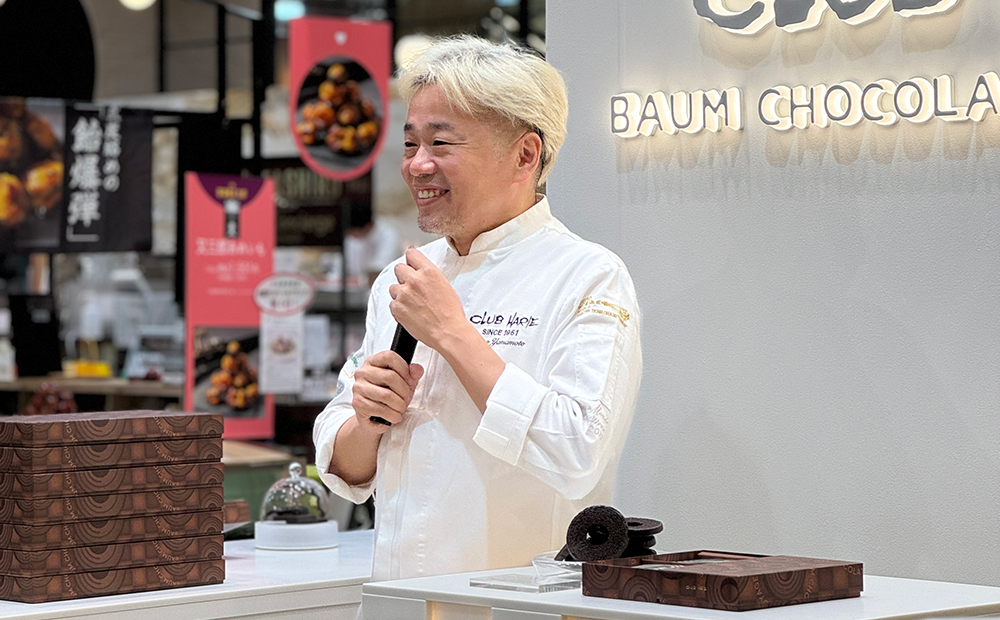 当日はオープン前に記者発表を行い、グランシェフ山本よりバームショコラ ド ヴォヤージュ開発の経緯や想いをお話させていただきました。