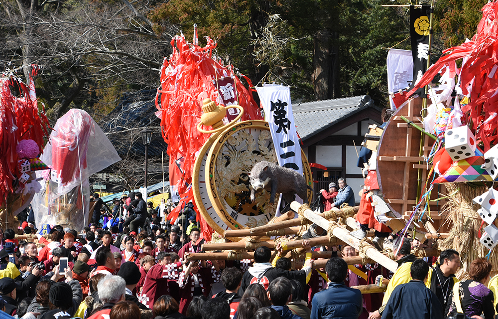 左義長まつりとは、毎年3月中旬に日牟禮八幡宮周辺で行われる厄除けと五穀豊穣を願う伝統の火祭り。