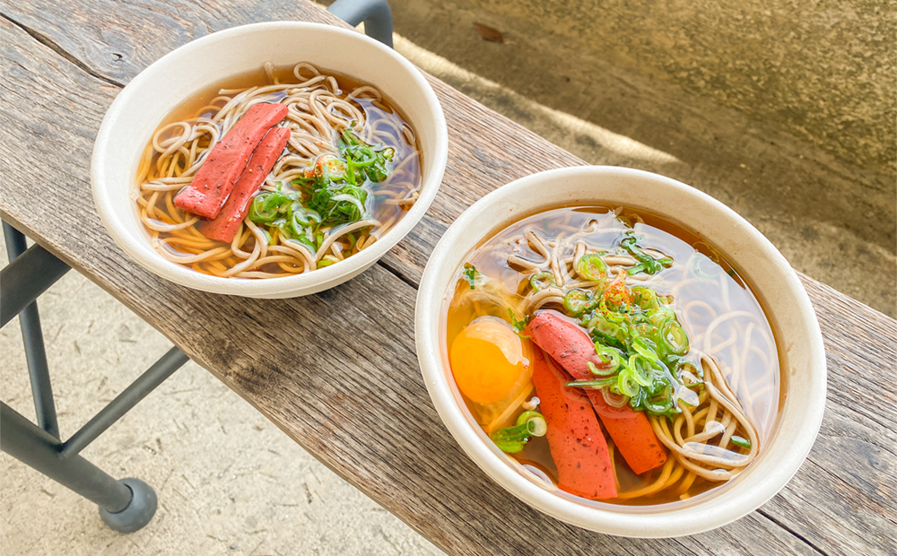 飾り赤紙を模した近江八幡名物の赤こんにゃく入りの「左義長そば」。