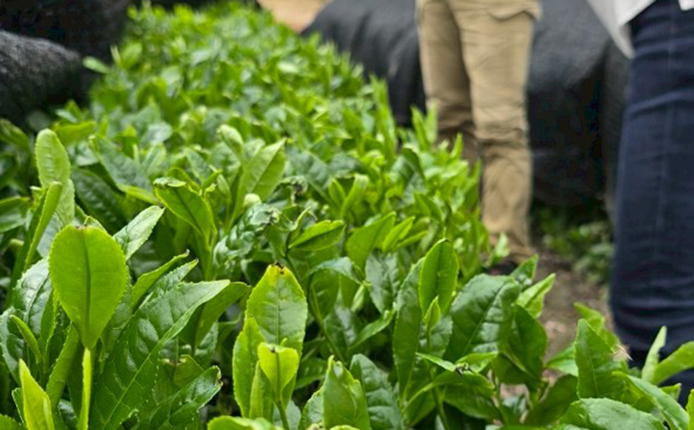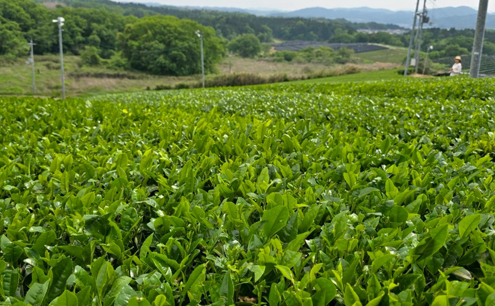 太陽に照らされて青々と輝く新茶の茶葉は見るからに柔らかそうでした。