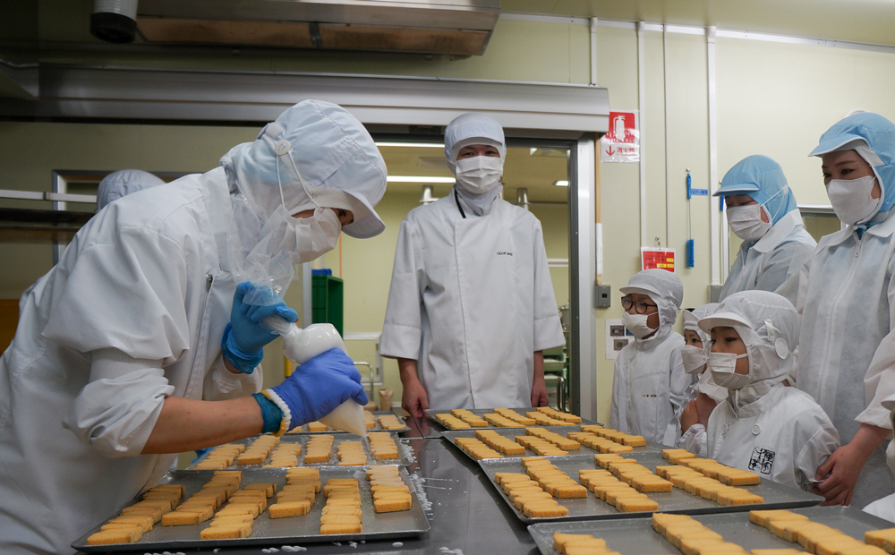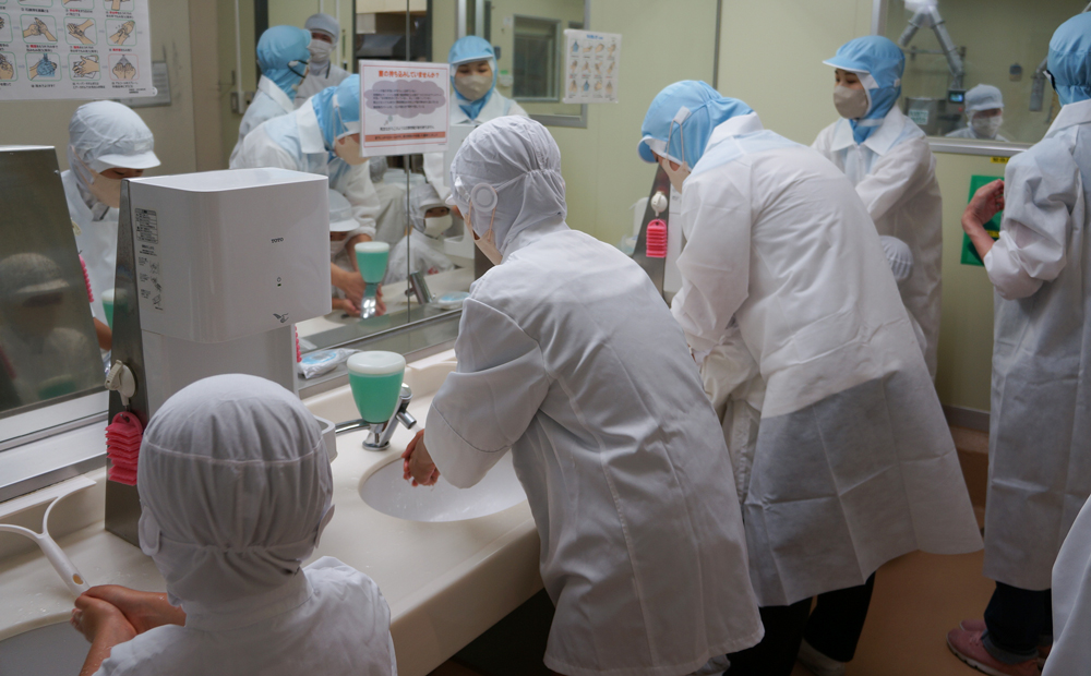工場に到着すると、まずはお客様に安全なお菓子を届ける準備から体験しました。