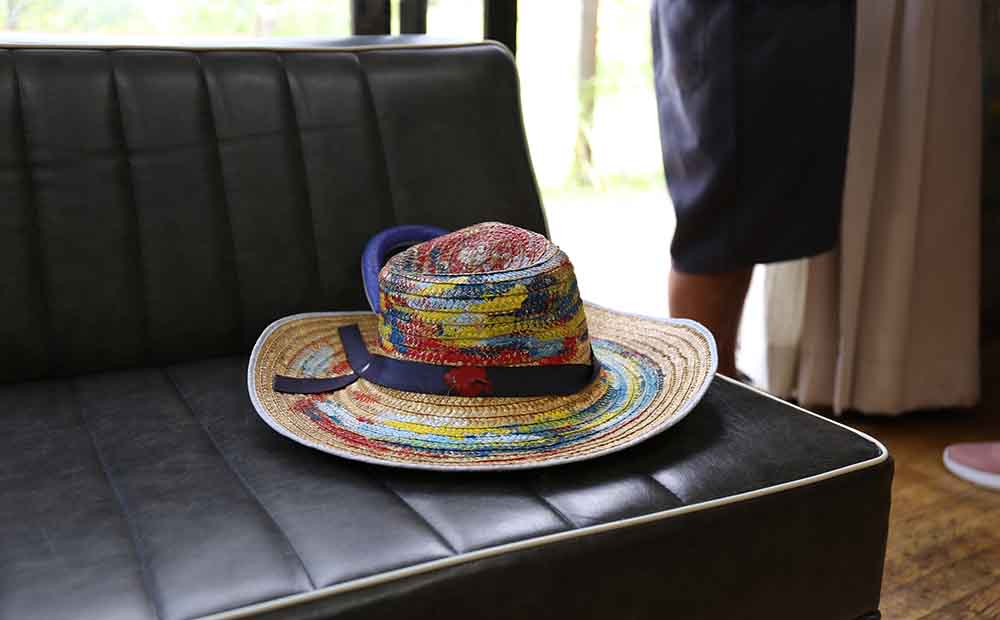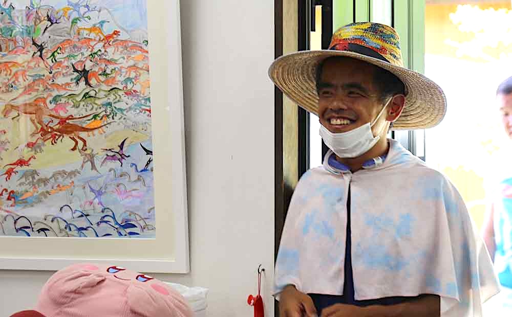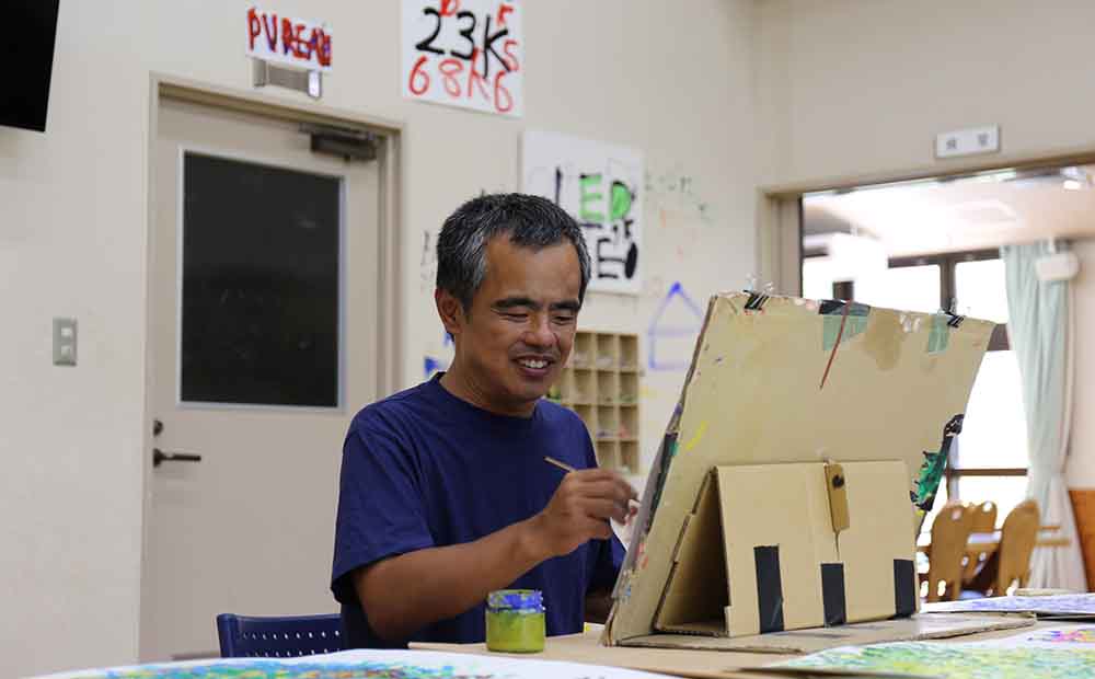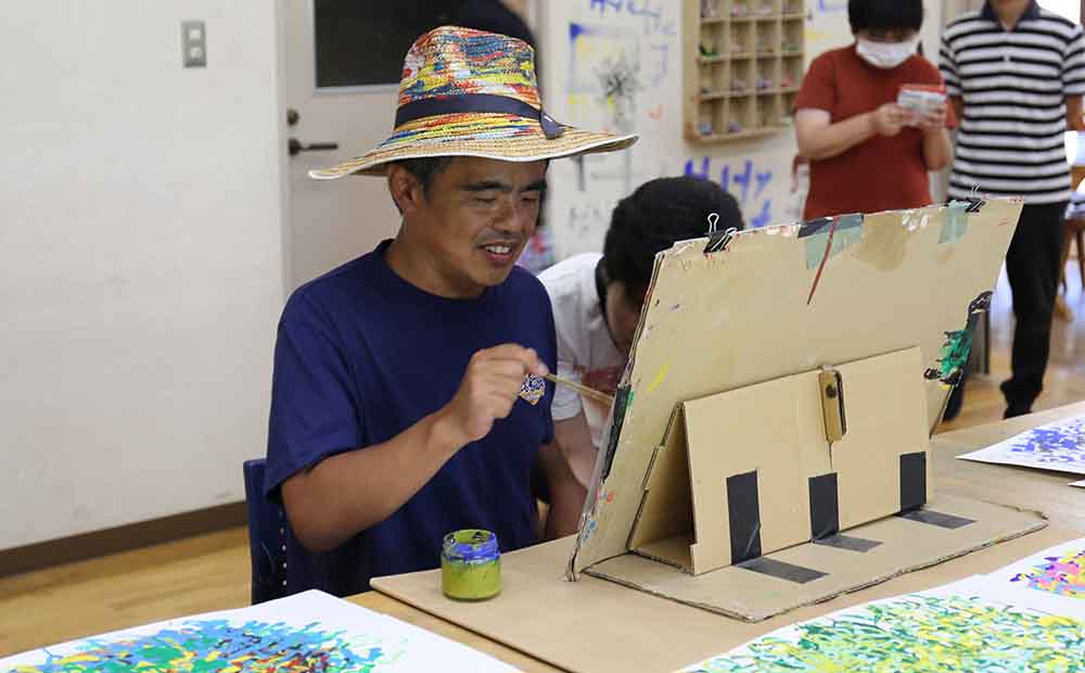 18歳からやまなみ工房へ通われ25年を迎えるベテランの川原さん。自分でペイントしたお気に入りの帽子をかぶって暑い夏でもお散歩が大好きだとのこと。伺った日も、真っ黒に日焼けをしておられました。