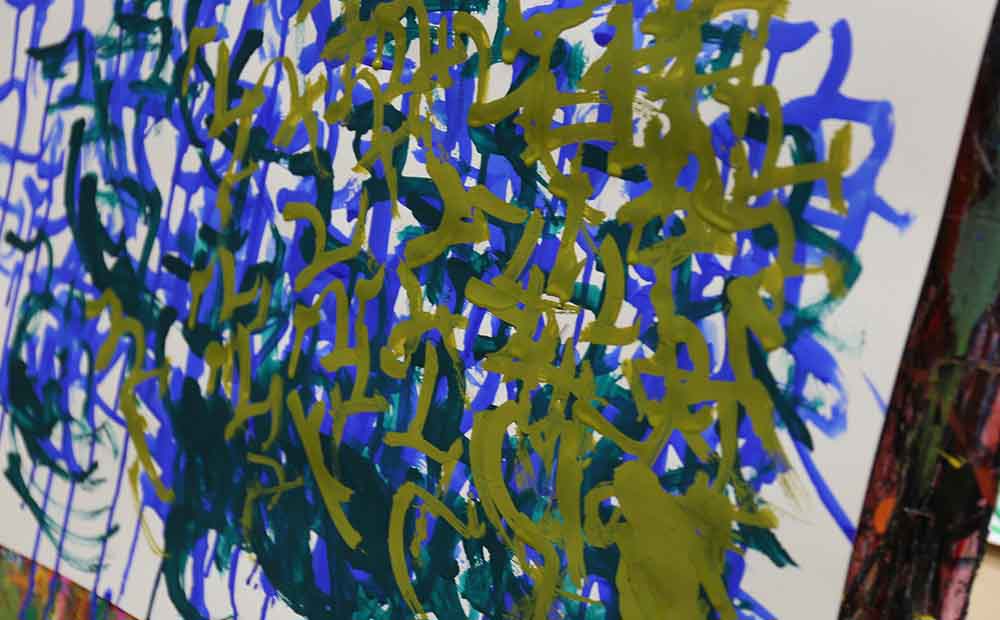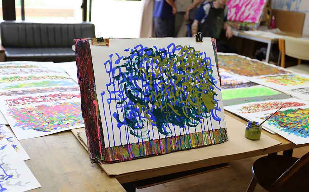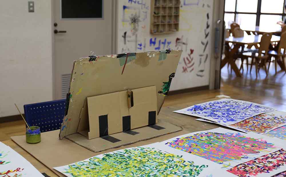 スタッフさん手作りの画板に向かって描かれているのは、自分の名前「なおき」の文字です。カラフルな色使いは全て川原さんが選んでいるそうで、作品によってはとても斬新な色合いのものもあります。