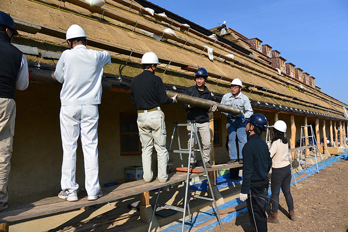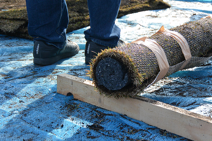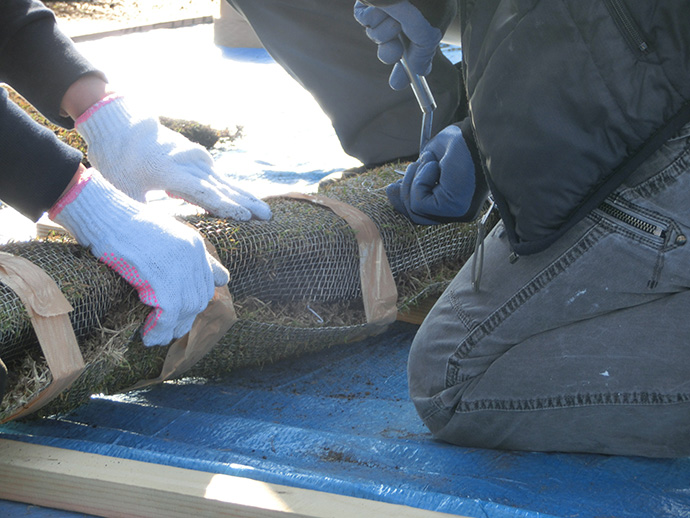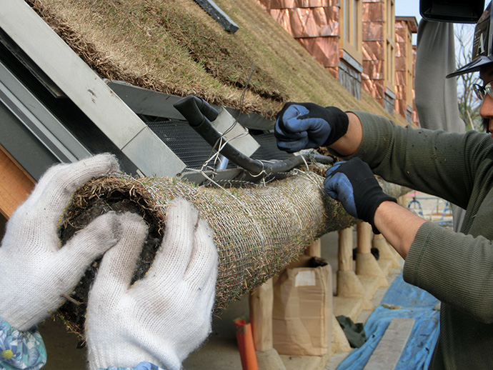 筒状にまるめた芝を軒につけることで、茅葺き屋根のような分厚い軒先が出来上がります。