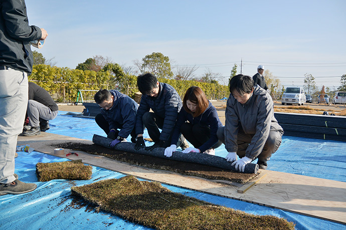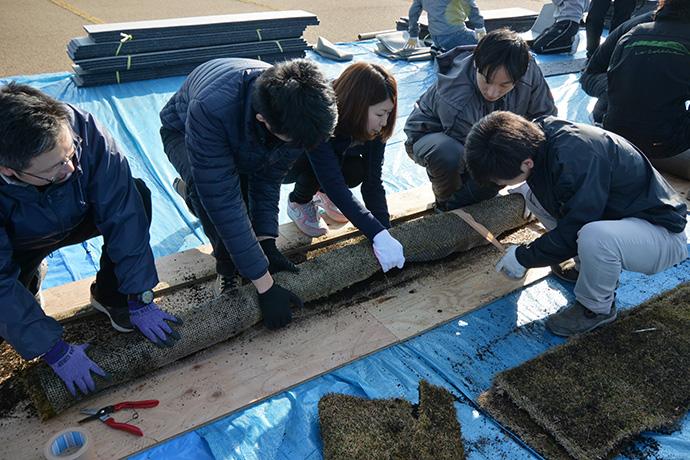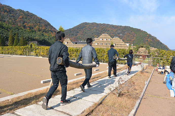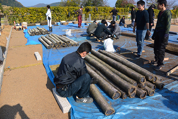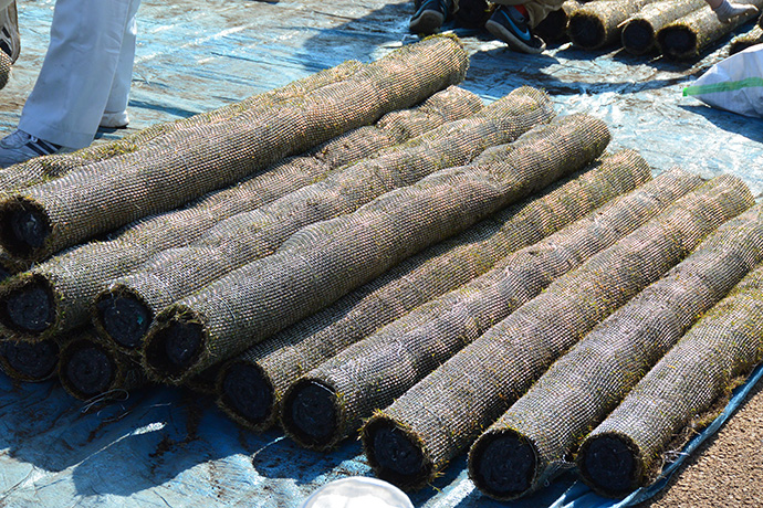 金網と芝、芝用下地を一緒にまるめ、番線で留める芝ロール。