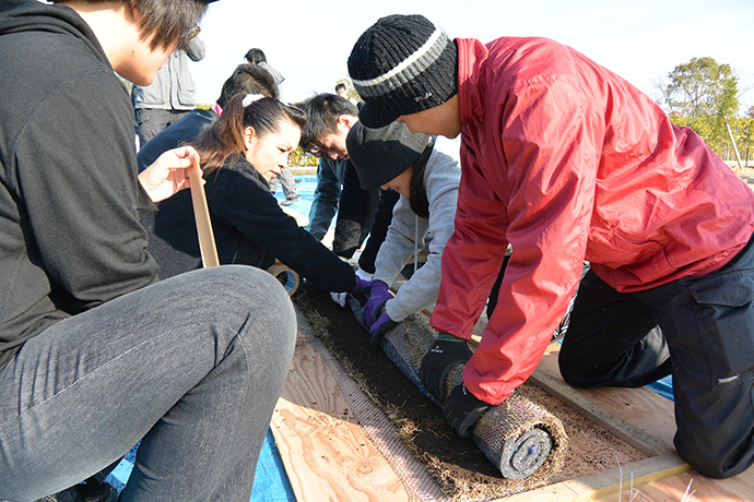 ロールの上にも新たな芝をのせ竹釘で押さえます。