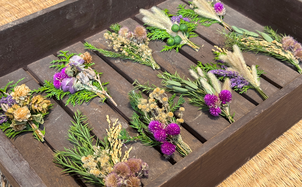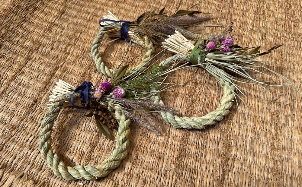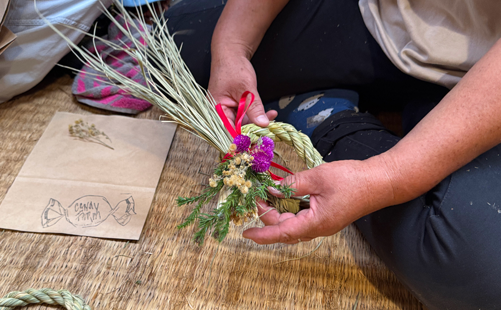 刈り取った稲わらや、ラ コリーナで採れた花材を使って「しめ縄づくり」のワークショップを行いました。