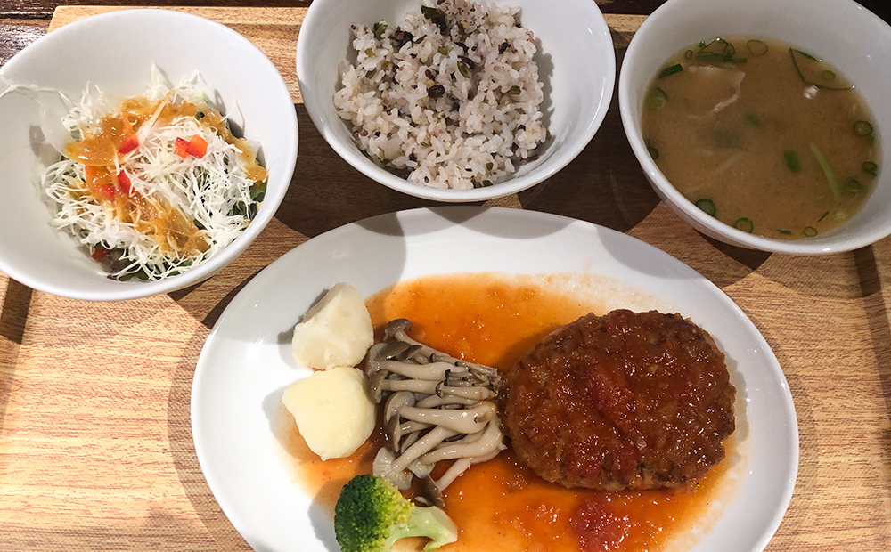 昼食は、まかない食堂の煮込みハンバーグ定食です。