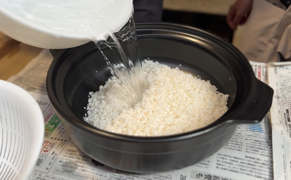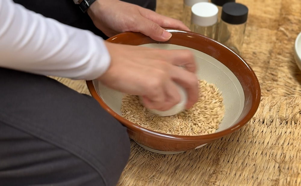 炊飯中には機械を使わない精米方法を体験していただきました。