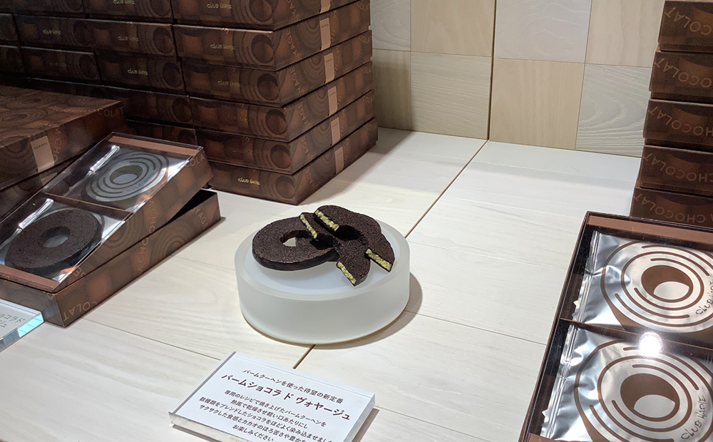 「バームショコラ ド ヴォヤージュ」は、専用のレシピで焼き上げたバームクーヘンを熱風で乾燥させ軽い口あたりにし、数種類のショコラをほどよく染み込ませたクラブハリエの新定番商品です。
