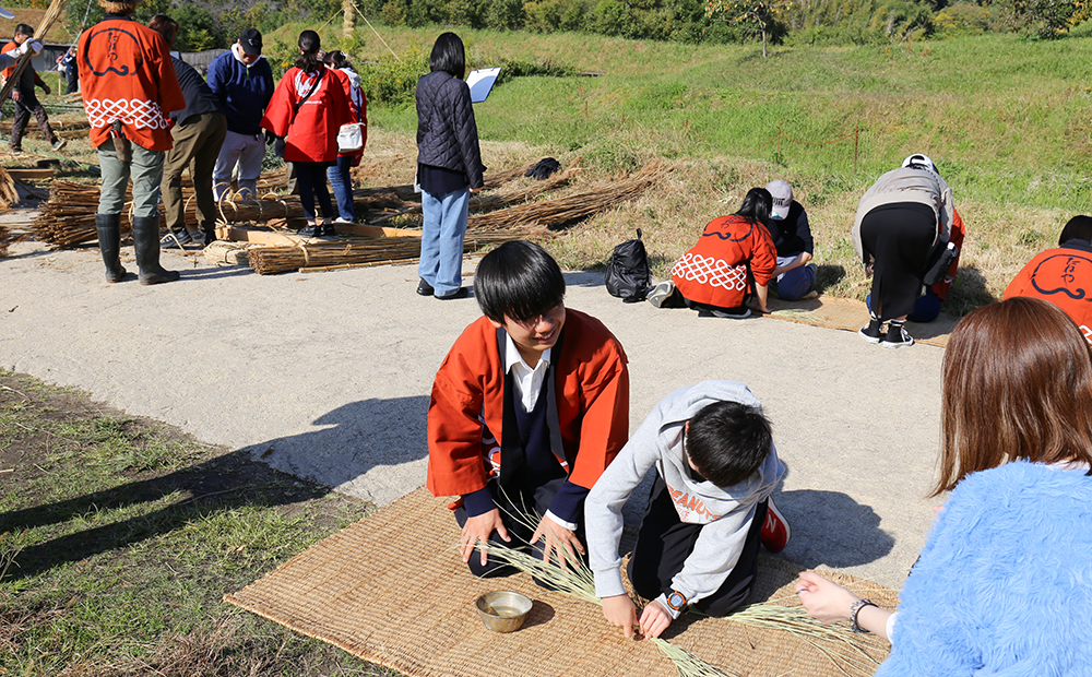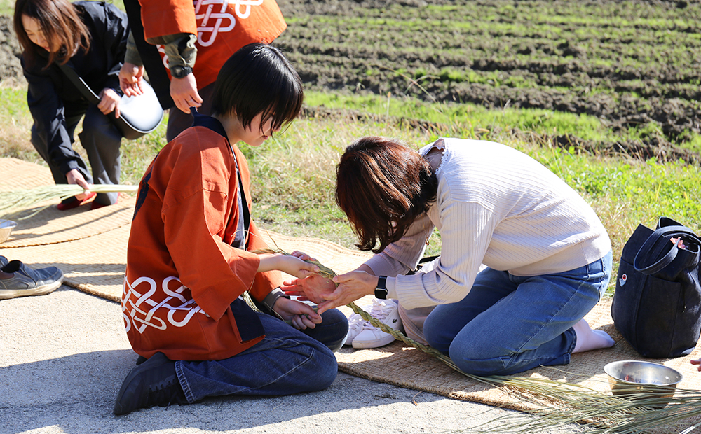 2016年よりラ コリーナ近江八幡の敷地内で行うこのイベントでは、近江八幡市内の各町ごとに 結(ゆ)う大きな松明(たいまつ)制作を間近でご覧いただけるほか、お客さまにもご参加いただけるワークショップのひとつとして「しめ縄作り」を開催しています。