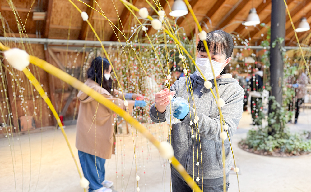少しずつ完成していく餅花。 キャンディーファームも日に日に華やかになっていきます。