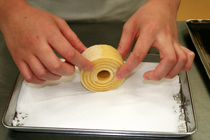 バームクーヘンのフォンダンのようにサブレのまわりはグラニュー糖が。6枚一緒に転がします。