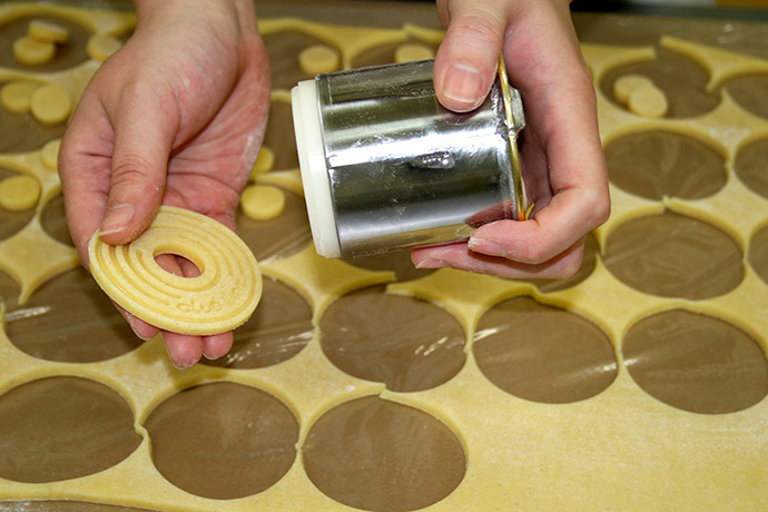 生地の固さは季節、天候、温度によって毎日違います。職人がもつ手先の感覚だけが、型を抜く力加減を知っています。