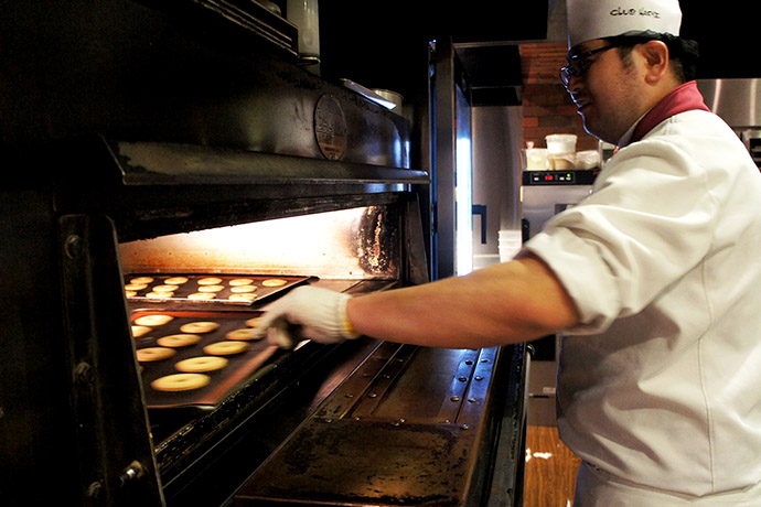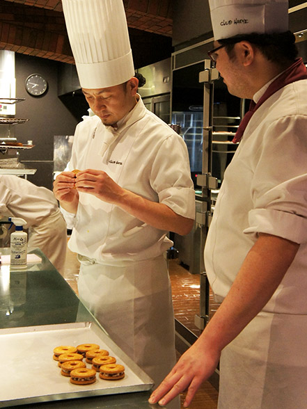 はじめに“バームサブレ”をご紹介します。「クラブハリエのバームクーヘンを素材に、その味わいが活きるお菓子を作りたい。」シェフのそんな思いが、8 年の歳月をかさねて形になりました。サクサク香ばしいサブレの中でふんわり香るのは、生地に練りこんだバームクーヘン。一枚、また一枚と手をのばしたくなる味わいを目指しました。