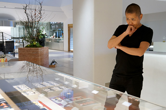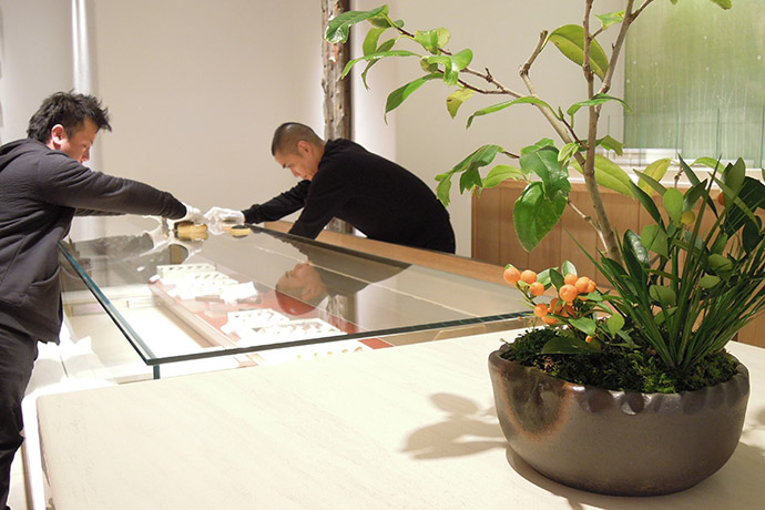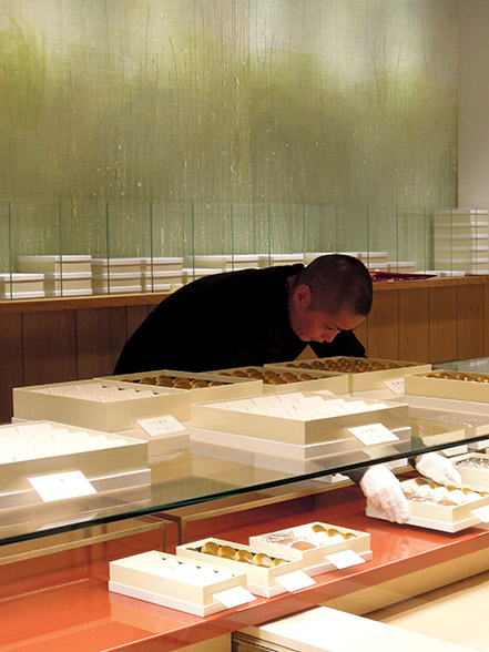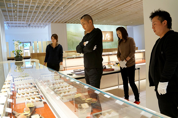 この日は和菓子の展示がありました。全部で18メートルにもなるケースに数えきれないほどの商品を並べるのですが、 一箱一箱、社長が手にとり、自らケースに並べていきます。