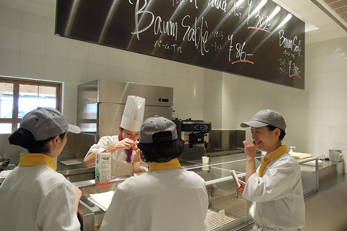 洋菓子売場では、バームサブレやバームソフトのテストをしていました。みんな新商品にワクワクしています。