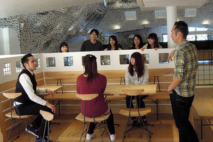 カフェではご案内方法をシュミレーション。クラブハリエ初のセルフスタイルのお店とあって、まだまだイメージしづらいこともたくさん。店長やスタッフが意見を出し合いチームワークを高めています。