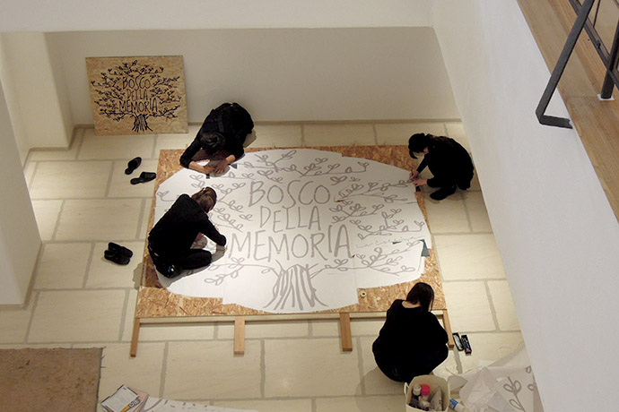 いつもはパッケージデザインを手がけるアート室のメンバーも集合。何やら大きな木を描いています。そこには“BOSCO DELLA MEMORIA(記念植樹)”の文字が。