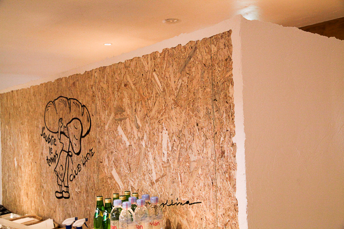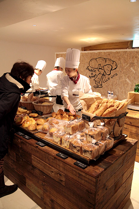 この特設スペースは事業部の部長自らが設えたもの。はじめは装飾のないシンプルな衝立だったのですが、建築家の藤森先生から側面を漆喰で塗るヒントをいただき、仕上げました。ジュブリルくんのマークが入って完成!とても空間にマッチするお店になっています。