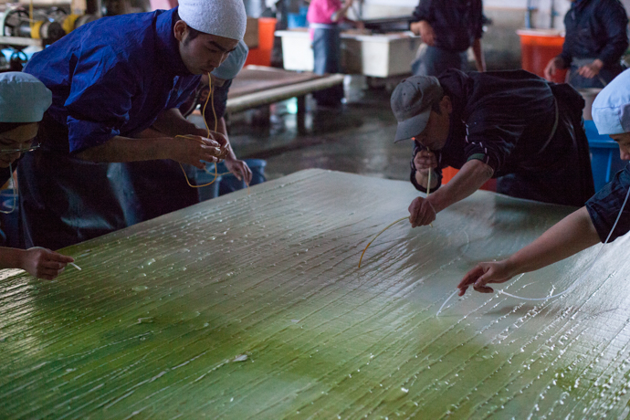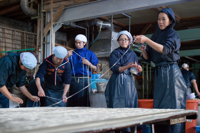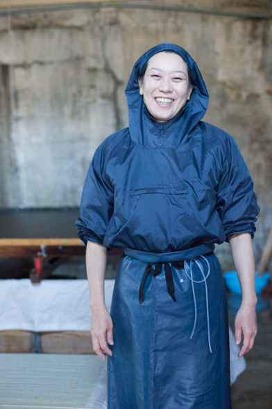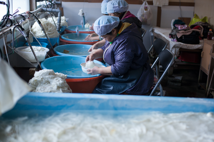 それらを釜で煮込み、やわらかくして色を抜く。案内してもらった部屋では、冷たい井戸水に手をひたしながら、細かな塵や砂粒をとる作業が黙々と続けられていました。