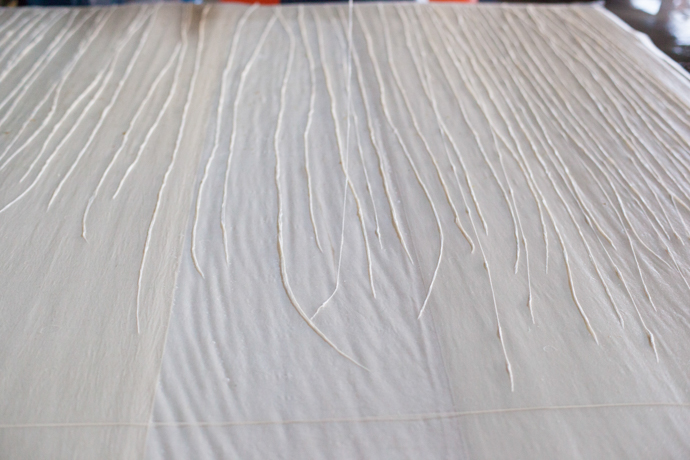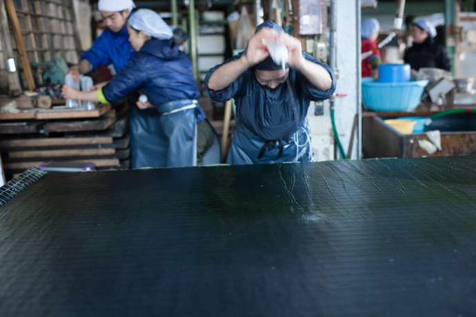 縦7尺(約2.1メートル)、横9尺(約2.7メートル)もの大きな漉き舟を操り、漉きこむこと計5層。たくさんの水が使われます。