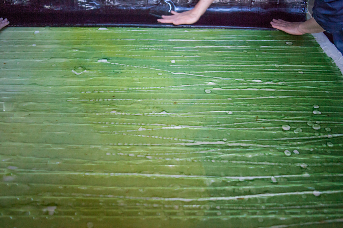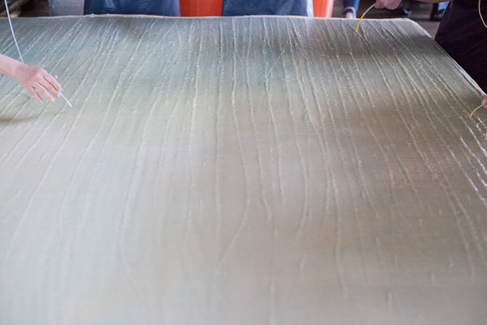 細やかに動きながら丁寧な作業をつづける職人さんたちは、まるでひとつの生き物のよう。和紙の層の間の数百個の気泡を一粒一粒吸い上げる作業も10人がかりで行われます。