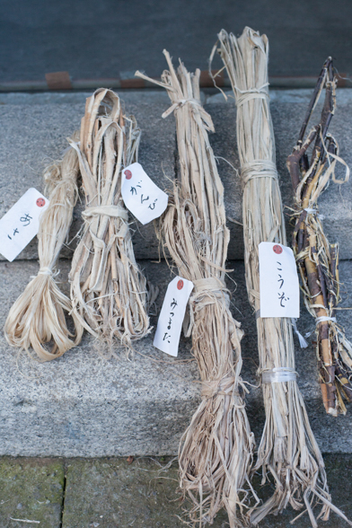凍てつく寒さの中、長靴にはき替えたわたしたちは、和紙の原料を見せていただきました。“楮(こうぞ)”、“三椏(みつまた)”、“雁皮(がんぴ)”など、天然の樹木が原料です。