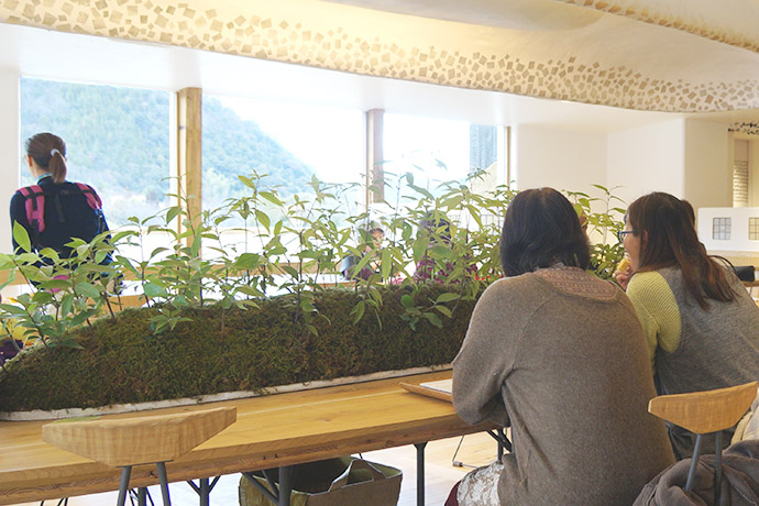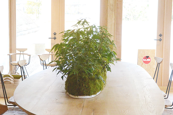 メインショップ2階のカフェには、大きなテーブルにユニークな苔山(こけやま)が!バームクーヘンを食べる目の前に、青々とした小さな森が広がります。
