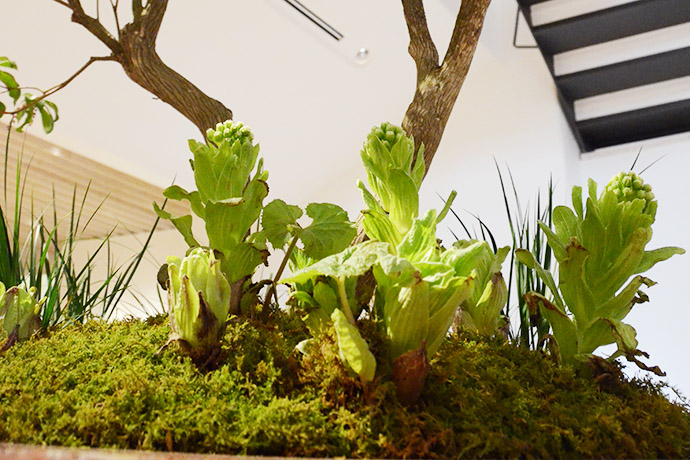 この時期、苔からはフキノトウがひょっこり顔をのぞかせています。植物たちに毎朝水をやり、お世話をしているのが「たねや農藝 愛四季苑(はしきえん)」のスタッフです。