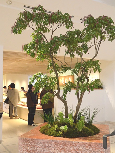 苔山から伸びる若い木は、3年前のどんぐりプロジェクトで、ラ コリーナ近江八幡の敷地から拾い集めたシラカシやクスノキ。今では約30センチに成長しました。店内でも新芽が芽吹き、柔らかい若葉を見せてくれました。
