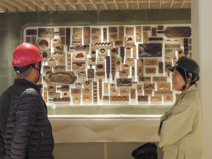 | ― | 店舗の壁には和菓子の木型をディスプレイしています。木を彫る職人さんがどんどんいなくなっていることを社長が話しをしていていましたが、それにもとても共感されていました。 |