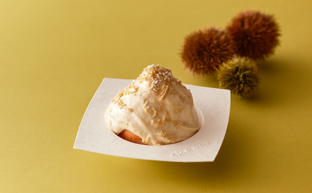 チョコレートをサンドしたバームクーヘンminiの上に新栗を使った栗アイス・濃厚な生クリーム・栗の泡をのせた新食感モンブランです。