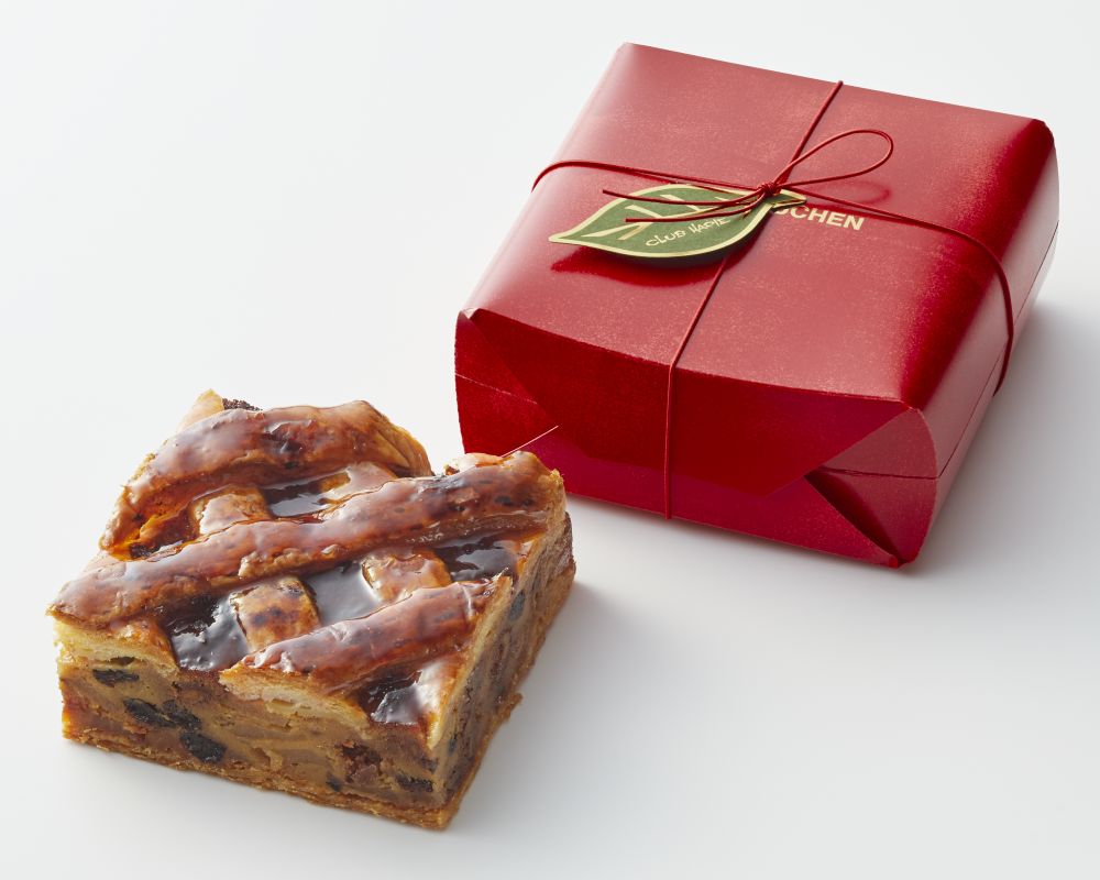 食感を出すため小さくカットしたバームクーヘンと、程よい甘さと酸味を持つ紅玉りんごをパイ生地ではさみこんがり焼き上げました。一日ねかせてさらに深い味わいに。仕上げにはりんごを煮出して作ったゼリーで、ほんのり赤い艶も添えました。