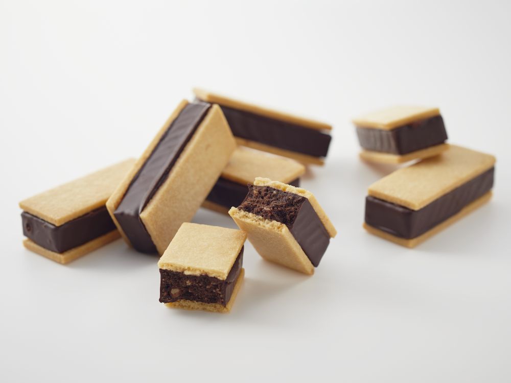 ほろ苦くしっとり仕上げたブラウニー生地をチョコレートでコーティング。サクサクのサブレでサンドしました。
