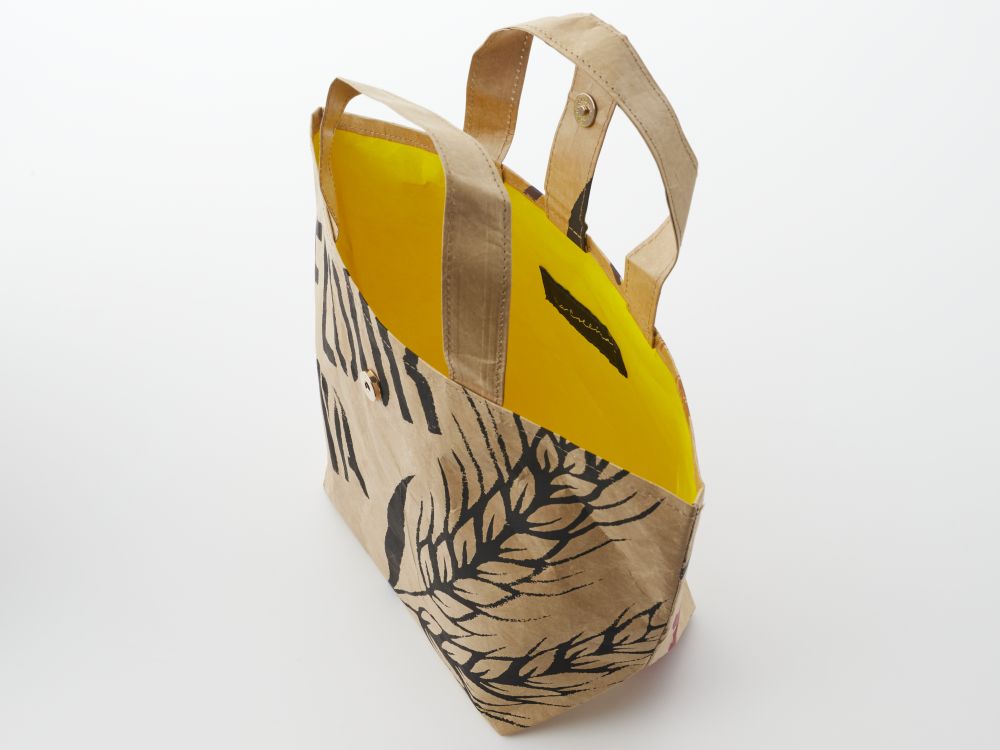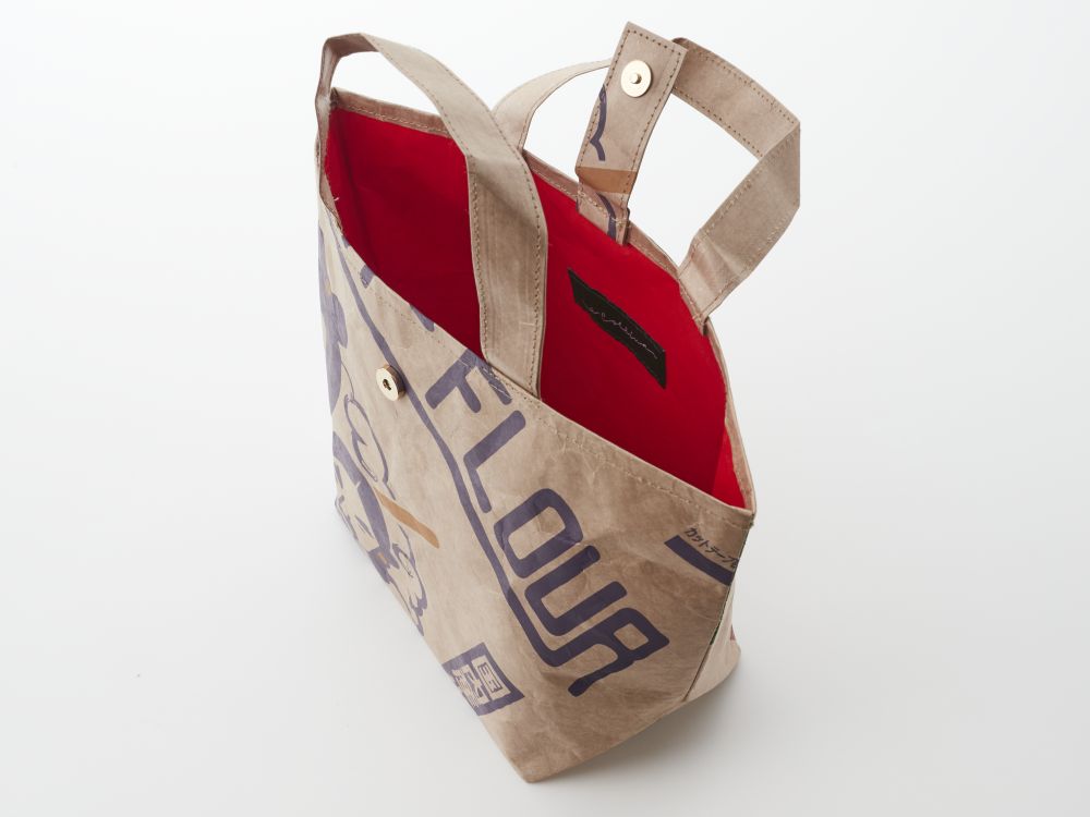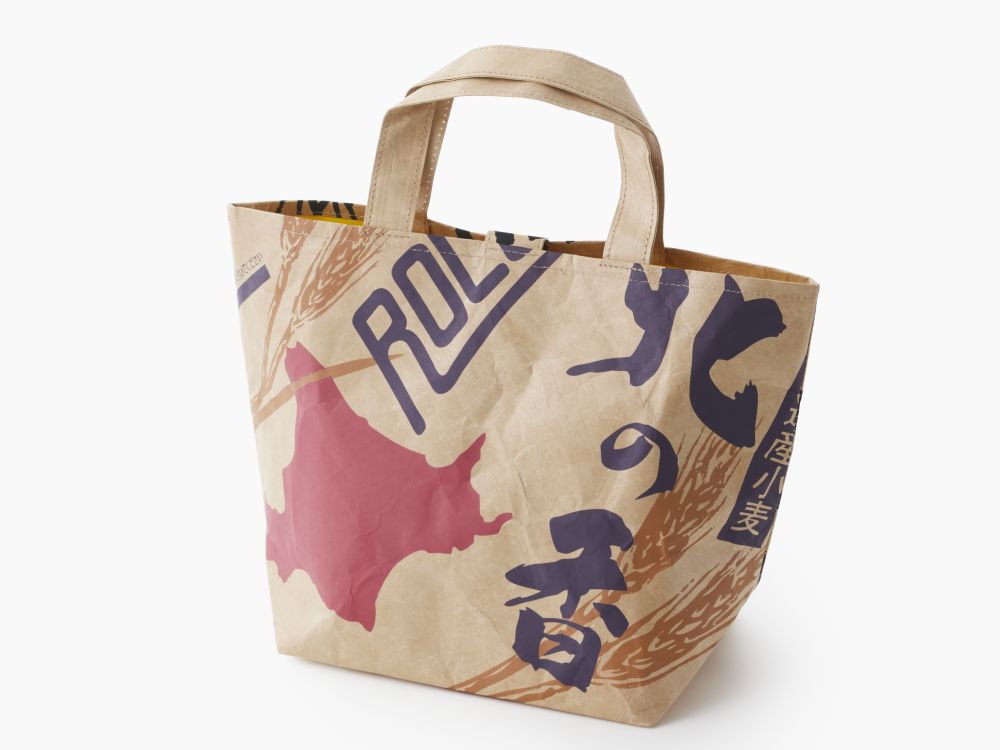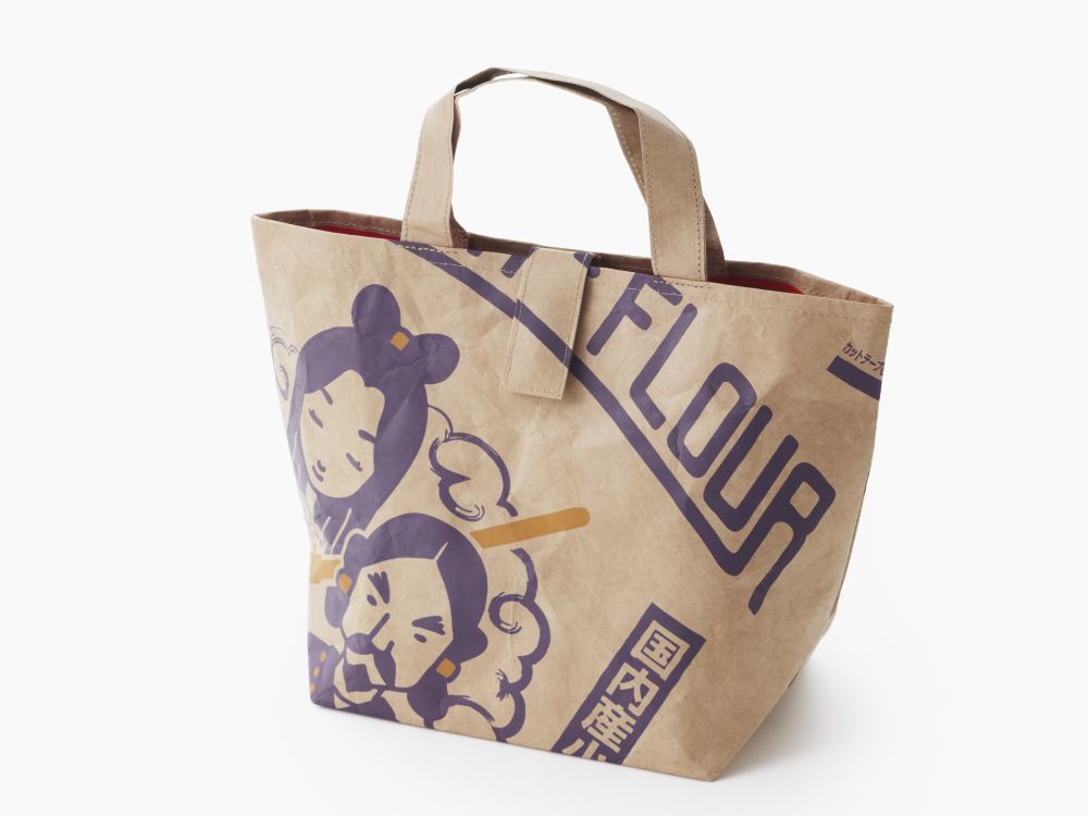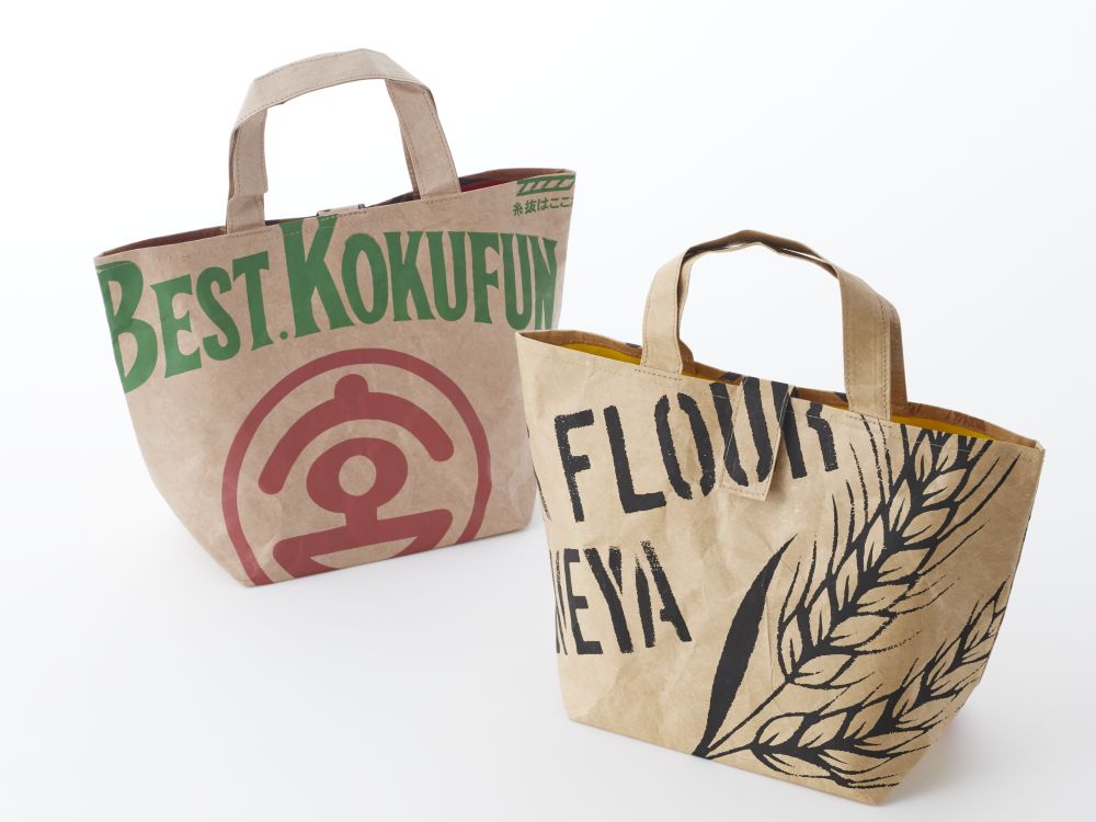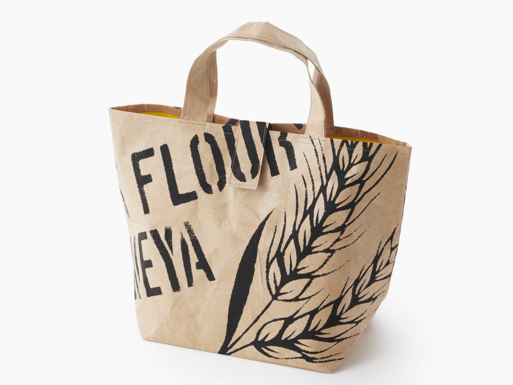 小麦粉や米粉など原材料袋のデザインをあしらった2種類のペーパーバッグです。長くお使いいただけるよう普段使いにもよい素材を選び、サイズにもこだわりました。